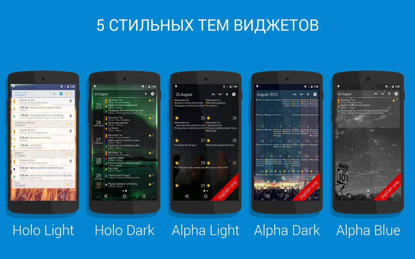 DigiCal — виджет календаря. Откройте для себя самый стильный календарь для Android со светлой и темной темами Holo, 6 полнофункциональными представлениями календаря и 4 красиво оформленными виджетами.