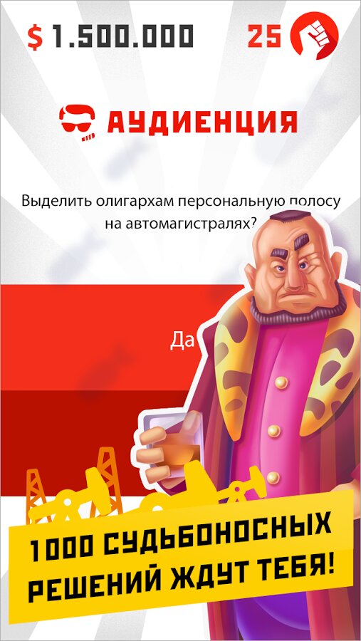 Вы — молодой диктатор свободной, демократической страны. Вас любит народ, у вас есть большие деньги. Ваша задача — продержаться у власти как можно дольше, прежде чем вас свергнут. Каждый день вы будете принимать к себе в кабинет представителя одного из шести сословий народа: полиция, военные, правозащитники, члены семьи, олигархи и народ. В ходе вашей аудиенции вам будет задан вопрос, на который вы должны дать четкий ответ: да или нет. От вашего ответа на ту или иную просьбу будут реагировать все сословия, кто-то положительно, кто-то отрицательно. Какую политику вести — выбор за вами. Только учтите, что каждый месяц правления равен одной аудиенции, что в свою очередь обходится вам в 100.000 у.е. Как только вы потратите все деньги или одно из сословий потеряет к вам интерес, произойдет революция и вы проиграете. Лишь в балансе всех групп кроется победа.
