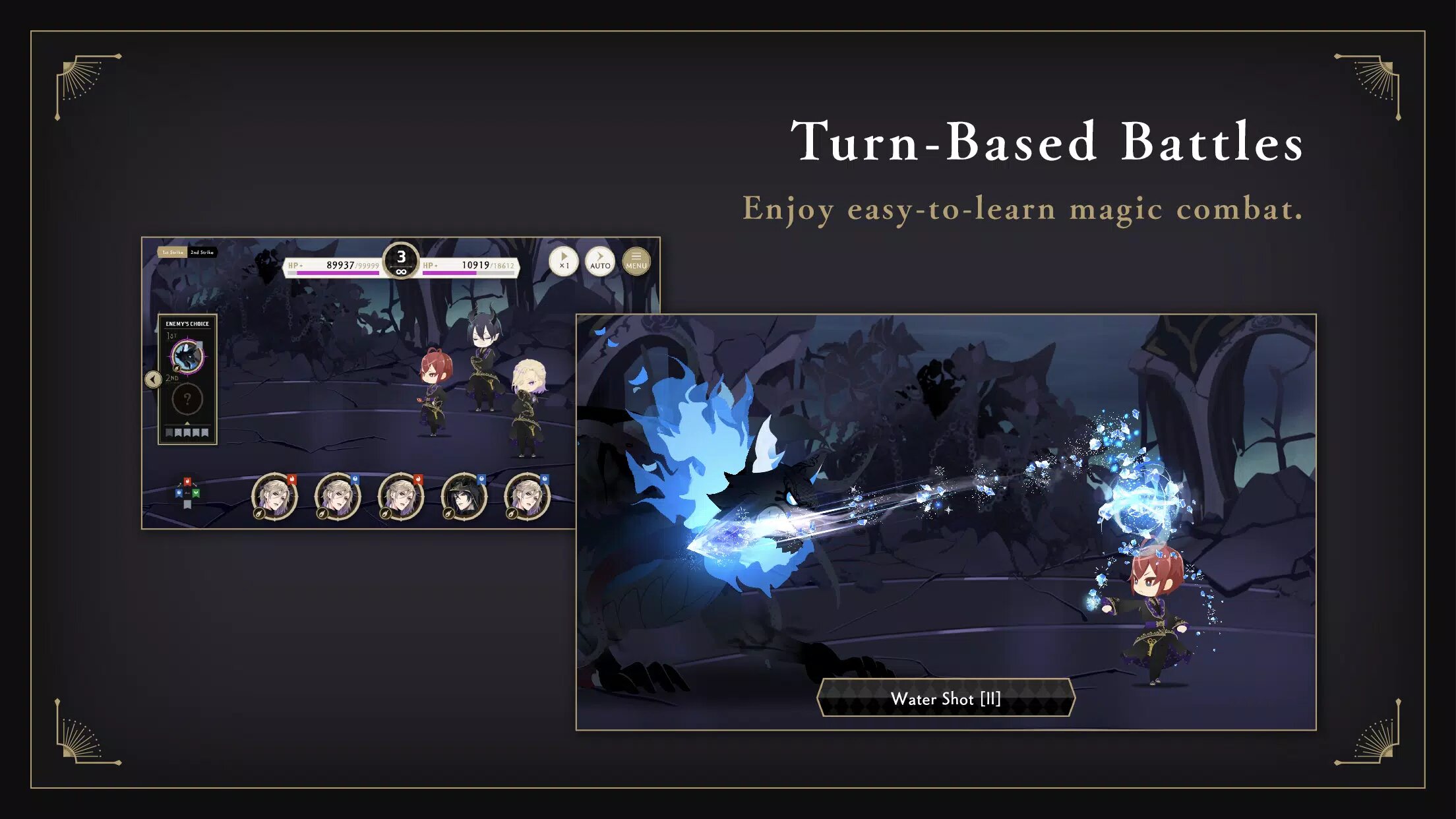 - Битвы, в которых персонажи сражаются, используя заклинания.