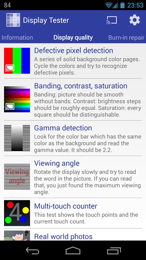 Display Tester – позволяет проверить практически все аспекты ЖК/OLED-экрана вашего устройства. С помощью Google Cast можно проверить качество изображения на экране телевизора. Программа разработана для полноэкранного тестирования также на устройствах с софт-клавишами (скрытие софт-клавиш в ICS и более поздних версиях, режим погружения в KitKat и более поздних версиях).