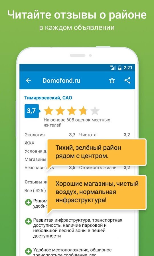 Кстати, район — это важно, поэтому мы предлагаем узнать о нем прежде, чем принять решение, когда вы хотите участок или квартиру купить или снять комнату. «Отзывы о районе» — еще одна полезная фишка, когда вы хотите переехать в другой город и думаете: «Сниму квартиру там, где безопасно».