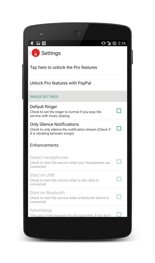Есть удобный виджет для рабочего стола, с которого можно управлять режимами звучания уведомлений. В Pro-версии программы доступны дополнительные функции вроде автоматического определения наушников и Bluetooth-аксессуаров. Также после покупки полноценной Don't Pause! удаляются рекламные объявления. В недавних обновлениях приложение Don't Pause! получило «материальный» дизайн интерфейса.