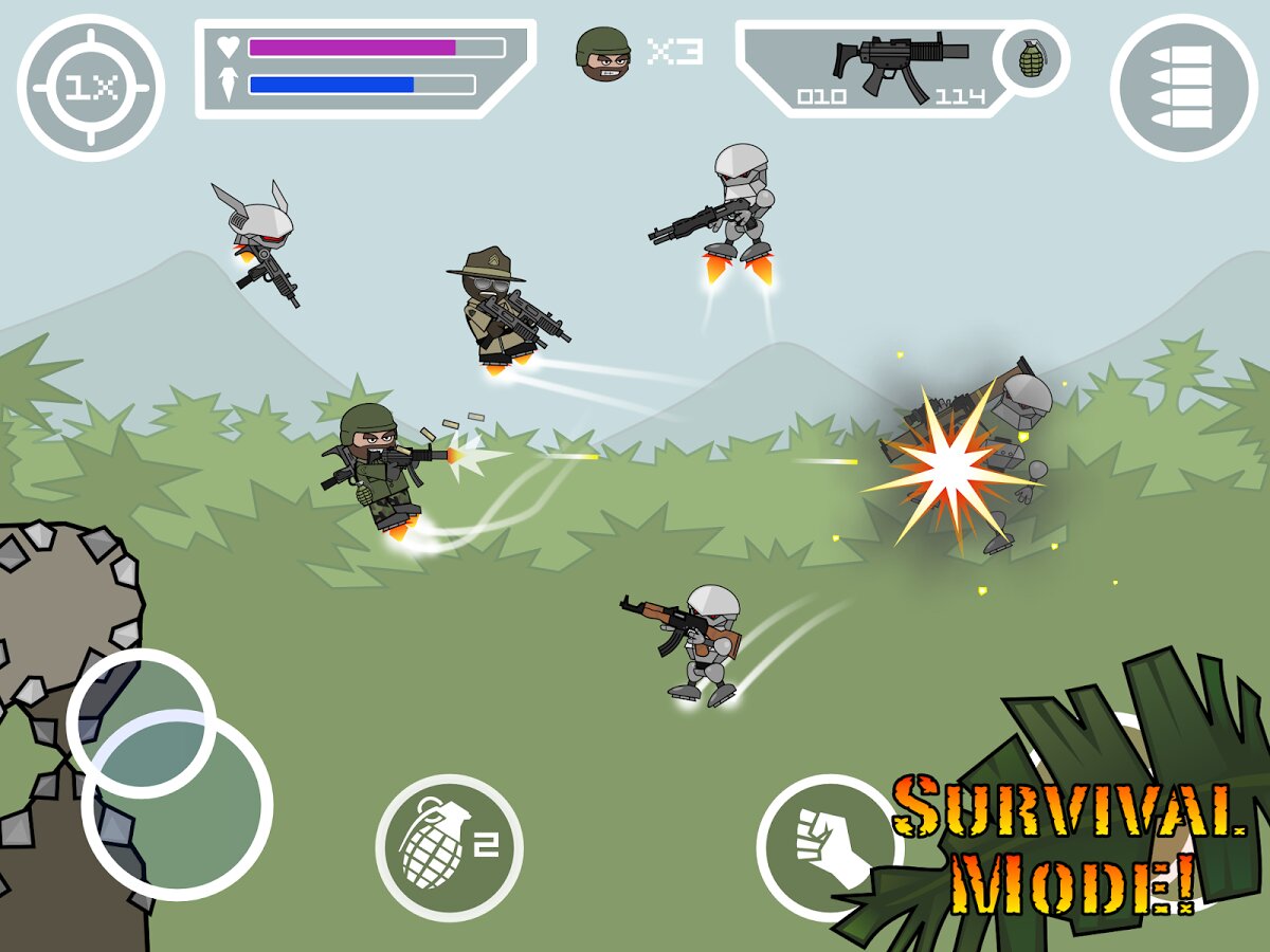 Doodle Army 2 Mini Militia – продолжение увлекательной игры на андроид, где вы возьмете в руки оружие и будете прокладывать себе дорогу сквозь джунгли. Это многопользовательская игра, в которую смогут играть одновременно до шести человек. Включайте режим выживания и оттачивайте свои навыки владения различным оружием, таким как снайперская винтовка, дробовик и огнемет. Управляйте своим героем с помощью джойстика расположенного на экране вашего телефона или планшета и открывайте для себя новые карты и локации. Применяйте специальные бонусы в виде реактивного сапога и летайте в течение длительного времени, уничтожая всех противников.