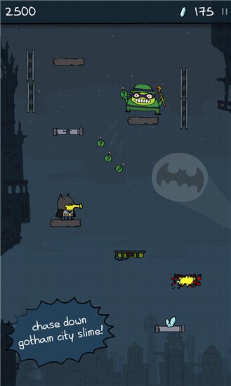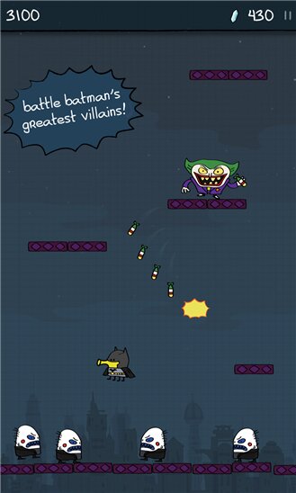 Doodle Jump DC – игра в которой вы будете управлять супергероем Бэтменом. Прыгайте все выше по платформам и старайтесь добраться до главных злодеев Готэма – Пингвина, Мистера Фриза, Джокера и The Riddler. Все злодеи Готэма собрались воедино и украли мощный кристалл, который может уничтожить весь город. Вашей задачей будет догнать их и уничтожить с помощью мощного оружия и снаряжения. Управляйте своим героем с помощью одного нажатия на экран и собирайте монетки и бонусы, которые помогут вам быстрее справиться со злодеями. Бросьте вызов своим врагам и покажите им, на что вы способны.