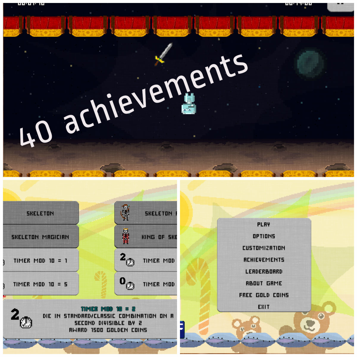 Double Jump — это увлекательнейшая пиксель аркада. Окунитесь в ностальгию вместе с красивой пиксельной графикой и изумительным 8-битным саундтреком. Управляйте персонажем и уклоняйтесь от разнообразных снарядов. Получайте достижения и открывайте новых персонажей, новые батуты, локации и снаряды. Настройте игру для себя, хотите прыгайте в космосе от астероидов, или сыграйте на кладбище Доктором Чумой. Разнообразьте игру с помощью типов, режимов и сложностей. 12 комбинацией игры не дадут вам заскучать. Специально для любителей посложнее, есть особо сложные достижения, а таблица рекордов позволит узнать самого лучшего прыгуна. Добро пожаловать в Double Jump, выживайте как можно дольше