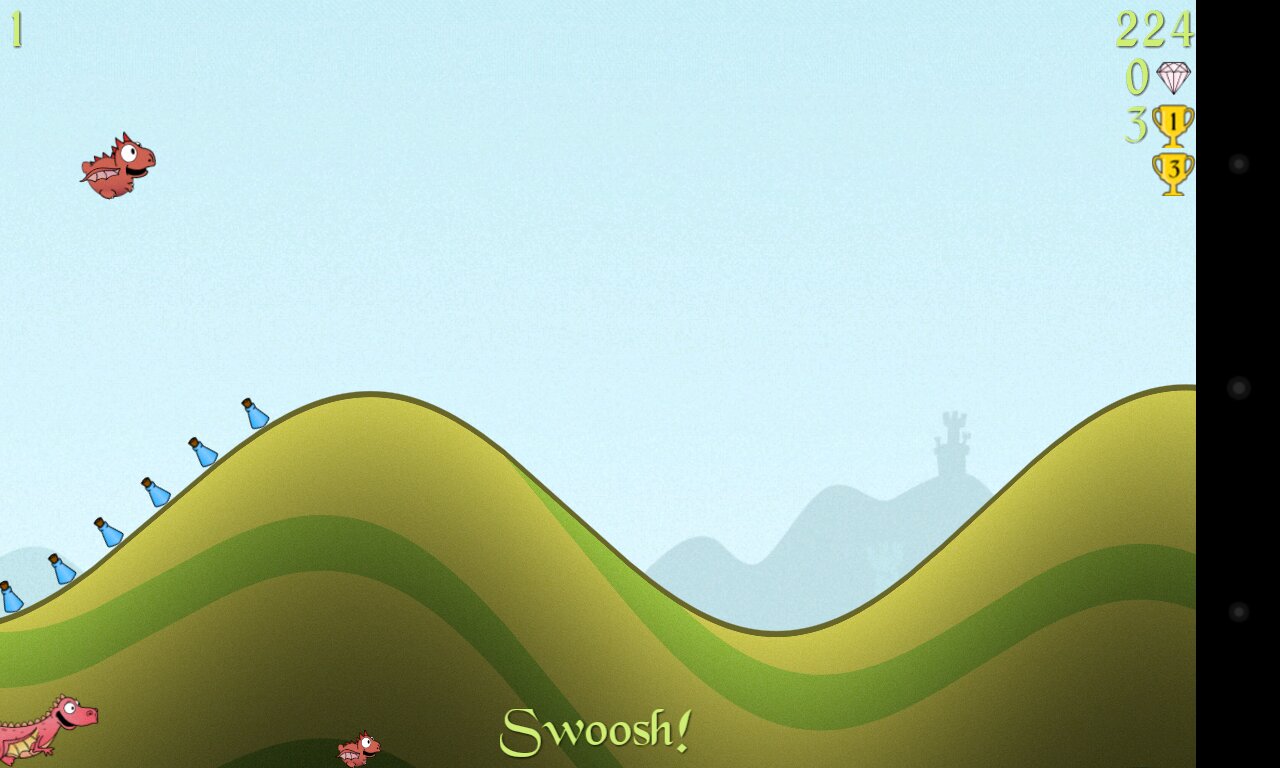 Dragon, Fly! — данная игра довольно специфическая и не требует особых навыков. Вам предоставляется возможность управлять полётами маленького дракончика. Dragon Fly одна из немногих игр, которая просто не прилагая больших усилий поможет Вам скоротать время. Вы будете пролетать над зелёными полями. Управление полётом Вашего дракончика состоит в нажатии на дисплей во время приземления, что дает возможность взять разгон для последующего полёта. Чем удачнее приземление, тем быстрее Вы пройдите данный уровень. В процессе игры Вы будете собирать различные бутылочки и алмазы, за которые даются дополнительные очки. Чем быстрее и выше полёт, тем возможность заработать много очков увеличивается.