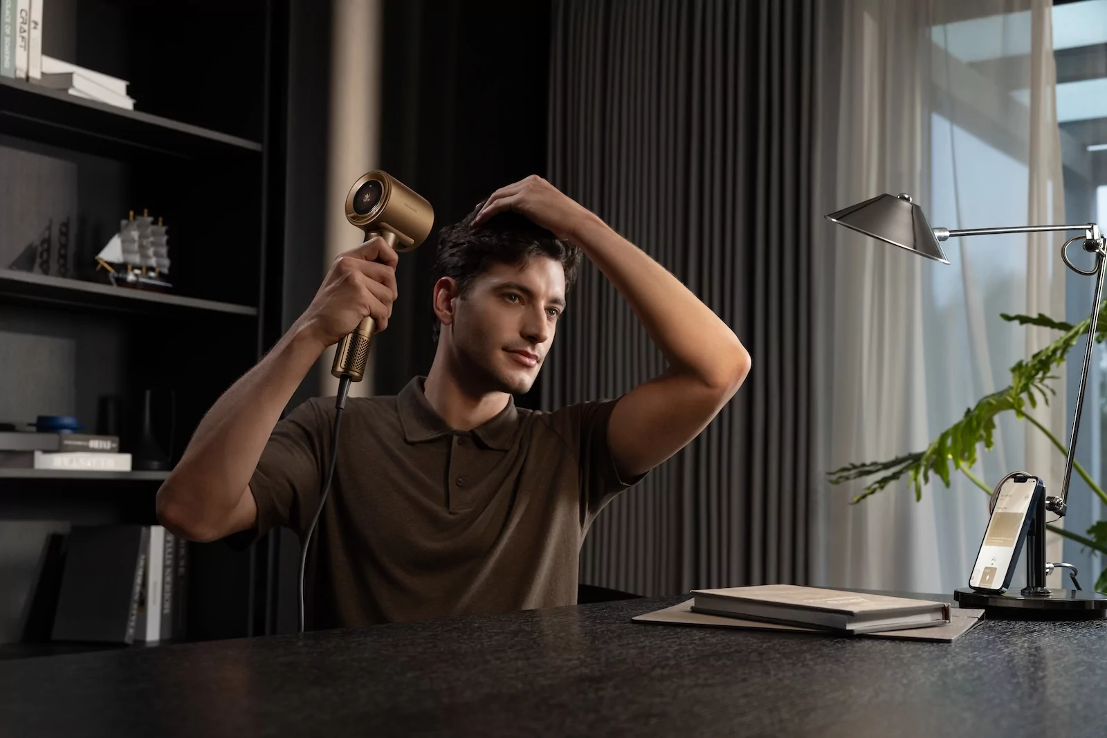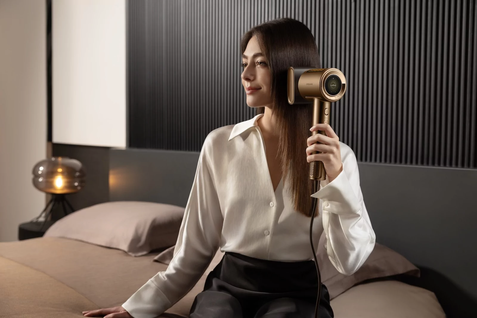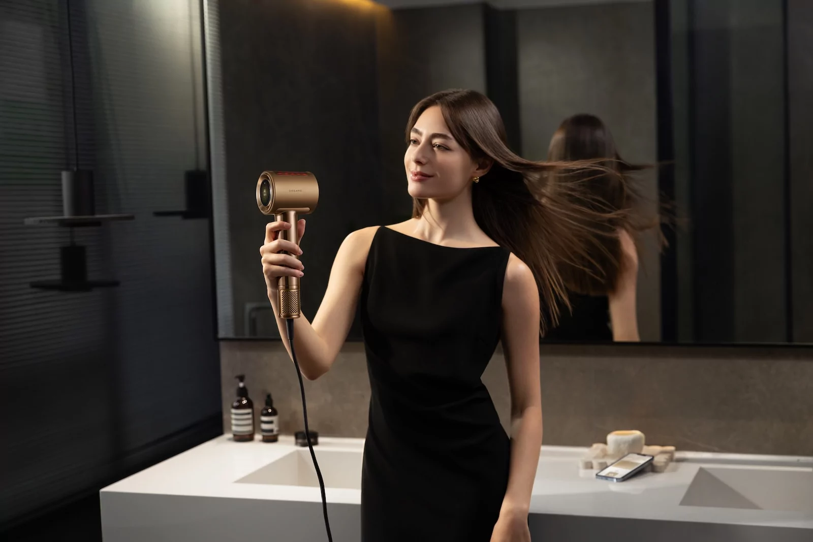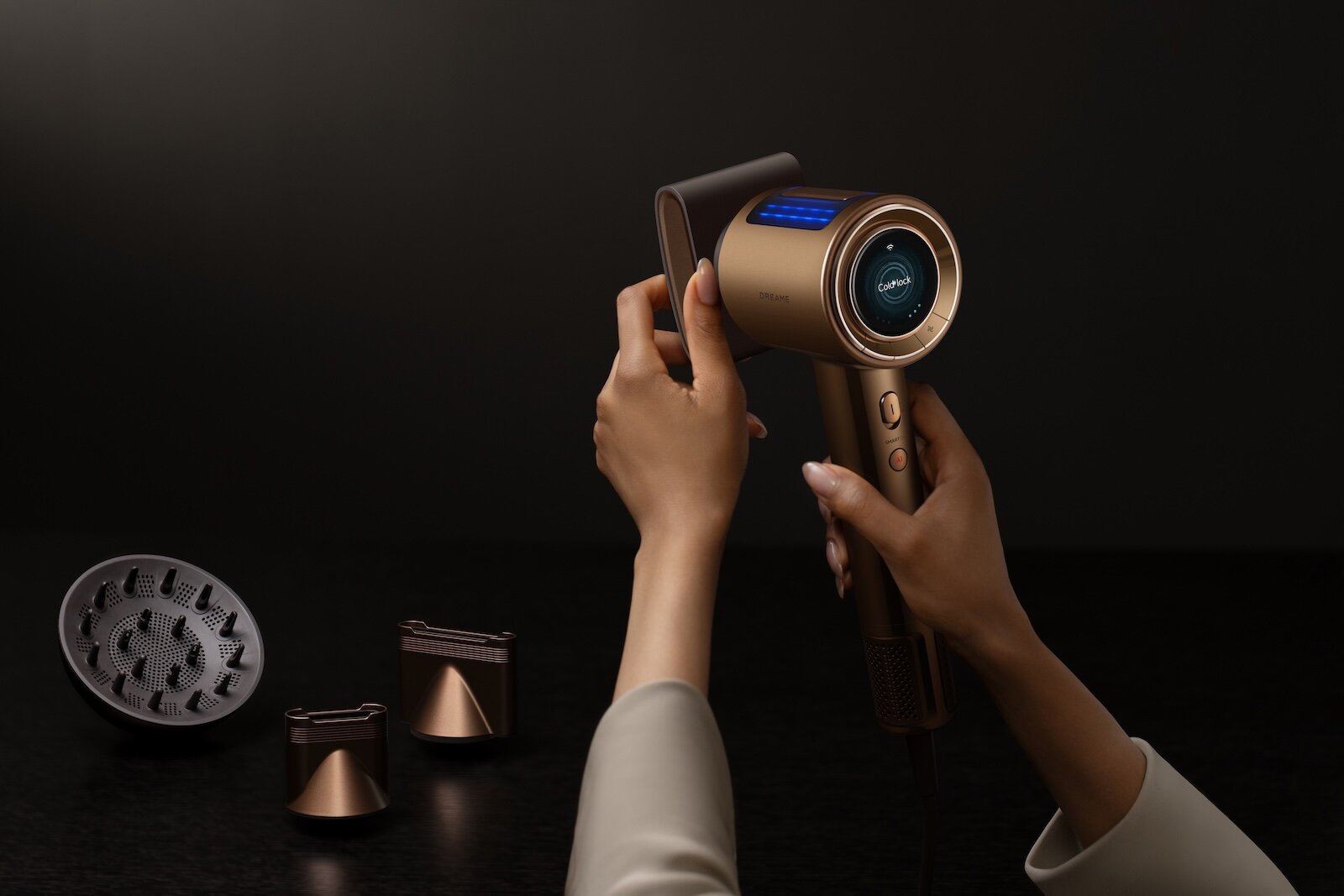 При этом на корпусе фена расположен специальный светодиодный индикатор, который меняет цвет подсветки (от синего до жёлтого, оранжевого и красного) в зависимости от расстояния. Более того, на тыльной стороне устройства расположен умный дисплей, на который системой выводится полезная информация о текущем ИИ-режиме сушки волос, температуре и скорости воздушного потока — в данном сегменте электроники такое встречается чрезвычайно редко.