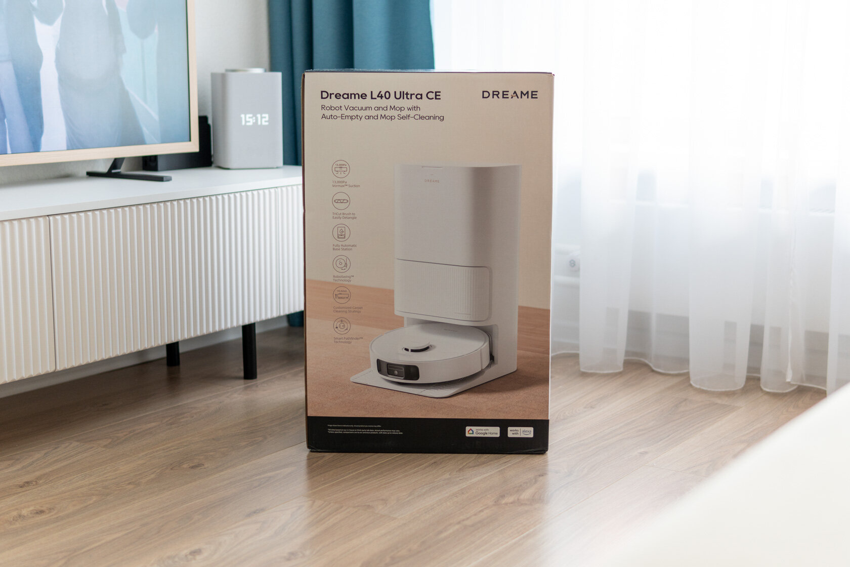 Поставляется Dreame L40 Ultra CE в достаточно крупной коробке с цветной полиграфией — выглядит приятно и солидно, что важно, если устройство покупается в качестве подарка. Обусловлены габариты тем, что помимо самого робота-пылесоса в коробке идёт ещё и большая базовая станция с внушительным набором функций, о которых я расскажу немного позже.