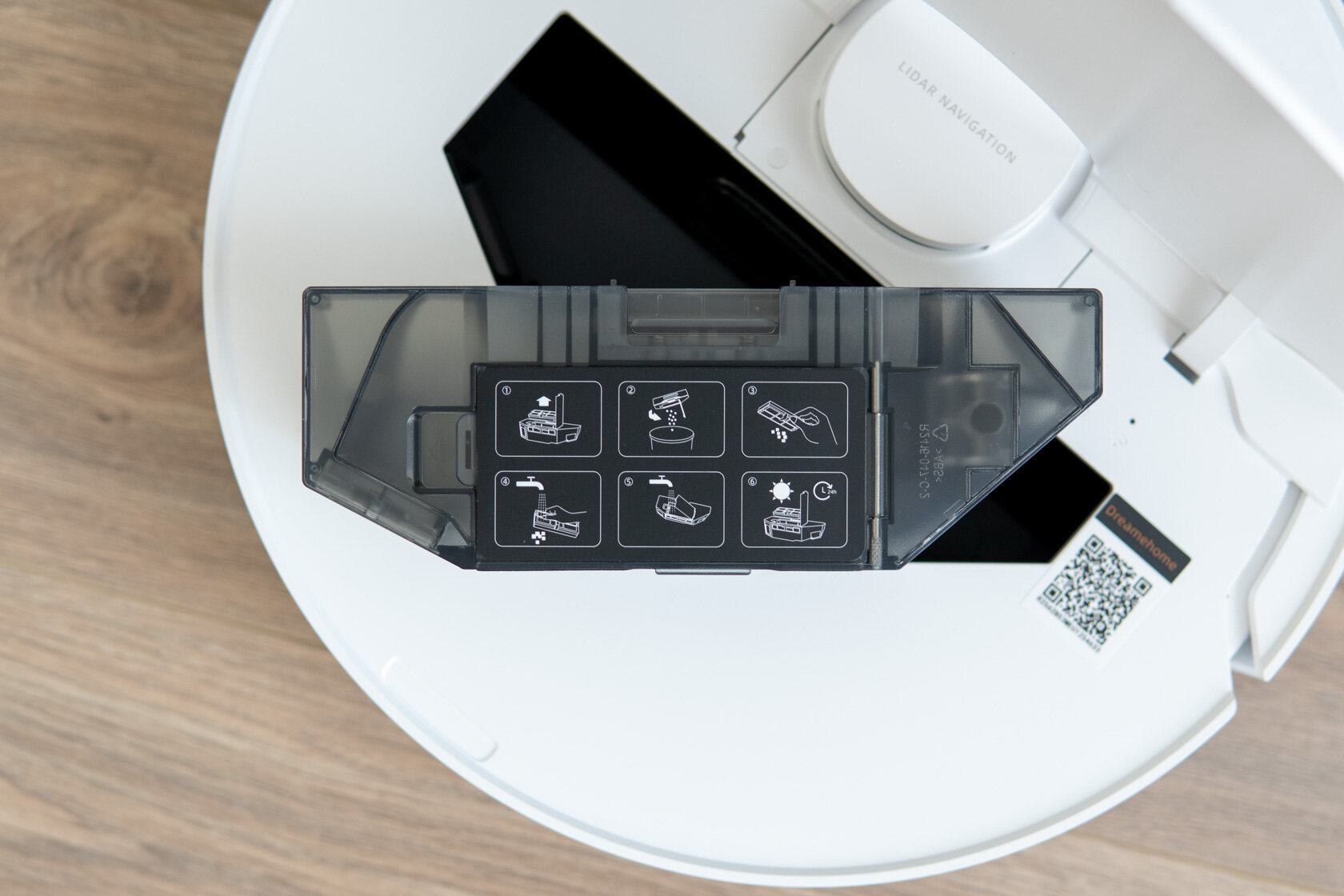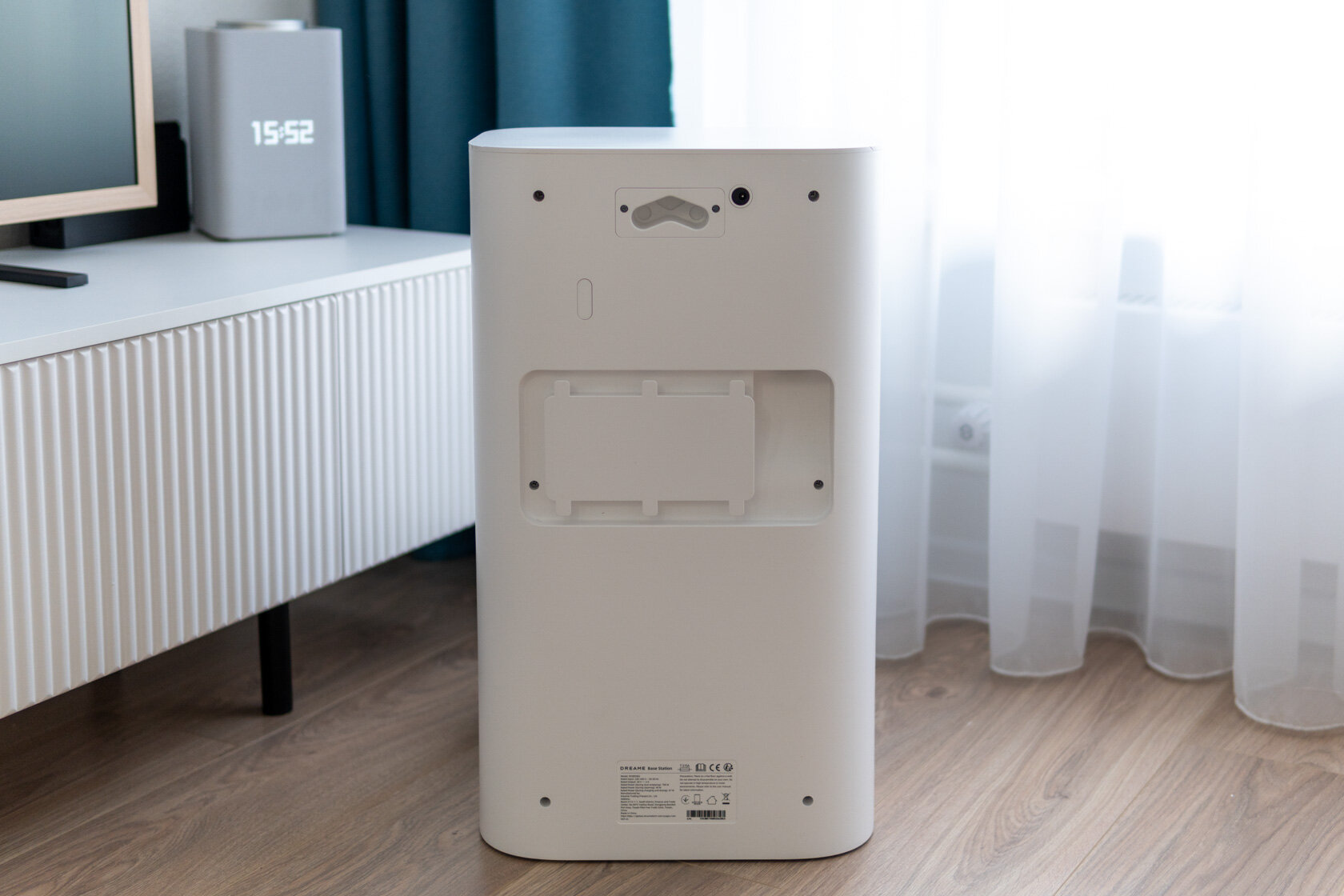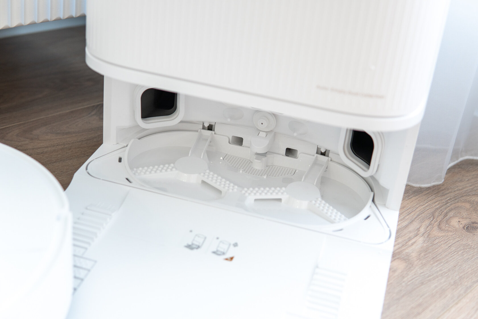 На фронтальной стороне базовой станции имеется специальная панель с текстурным покрытием, за которой спрятан объёмный мешок для сбора мусора. К ней есть постоянный доступ, а для наполнения водой отсеков для жидкости нужно открыть крышку сверху. А так как сама крышка плоская, её вполне можно использовать в роли подставки для чего-то не очень тяжёлого.