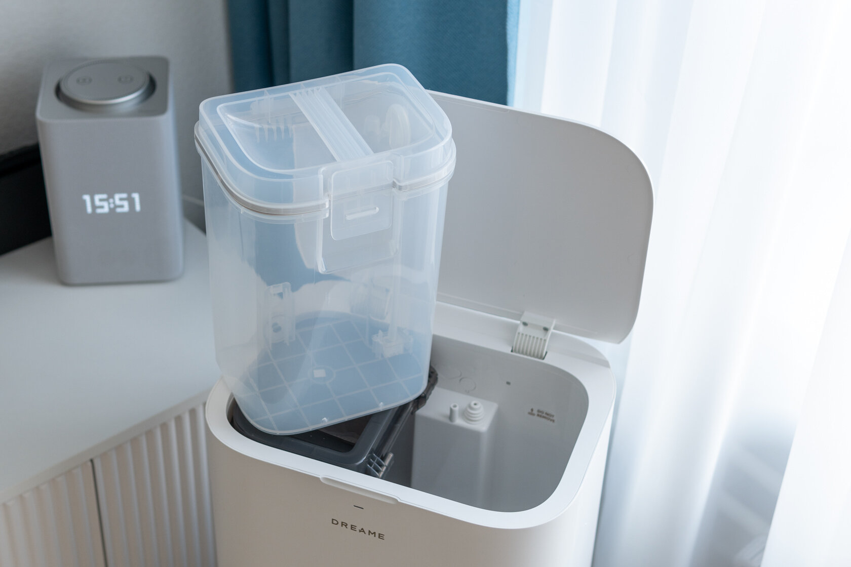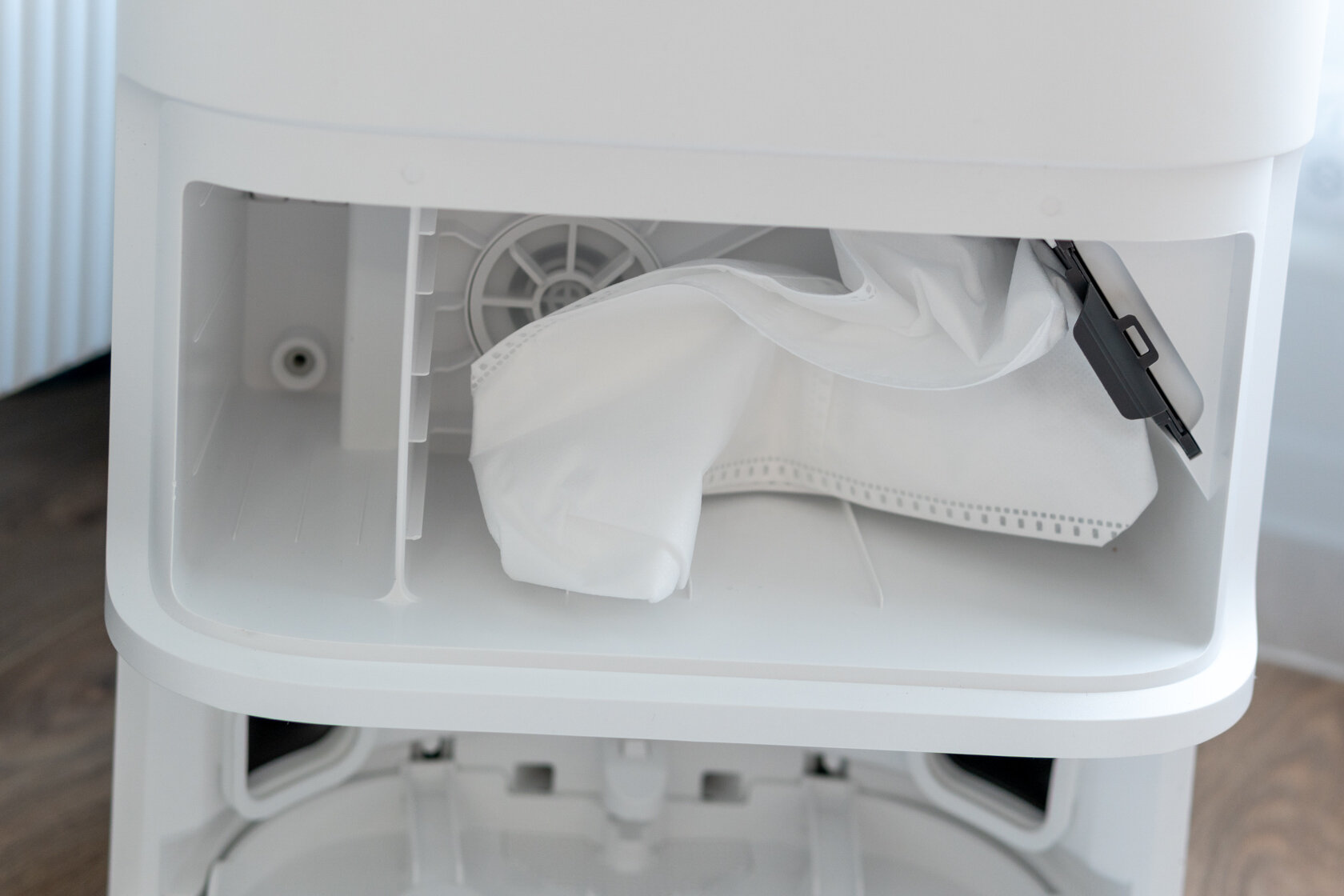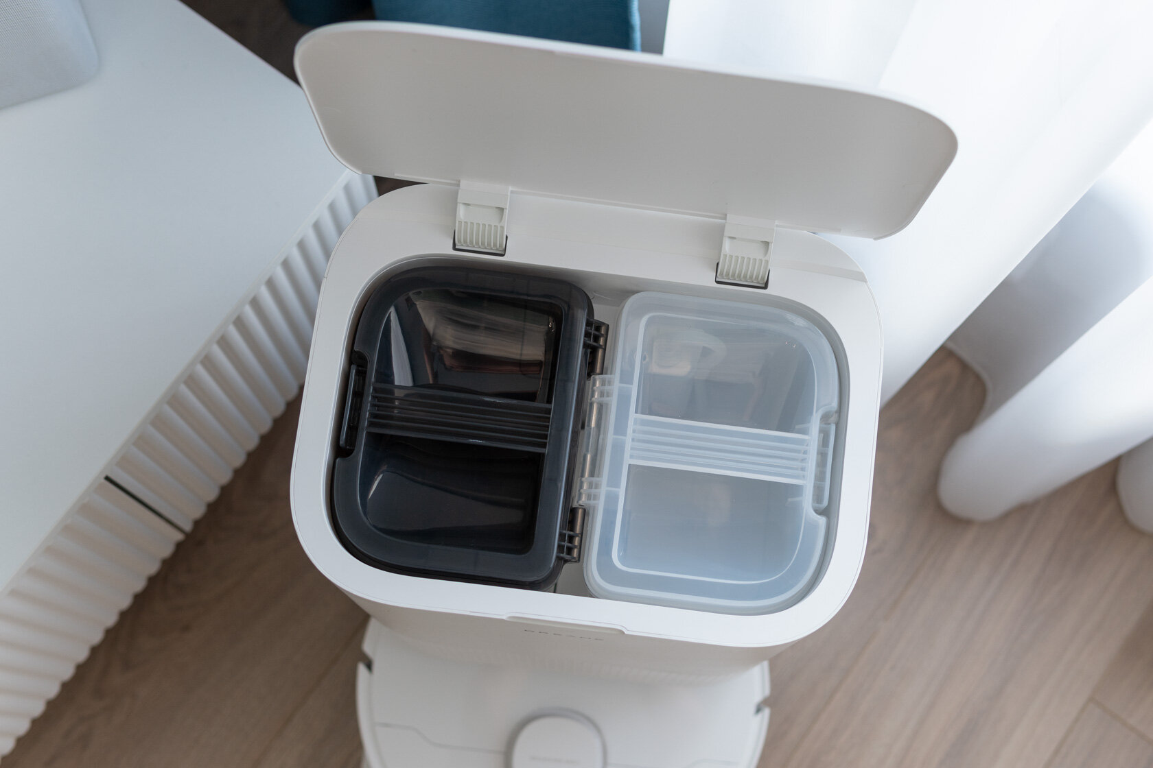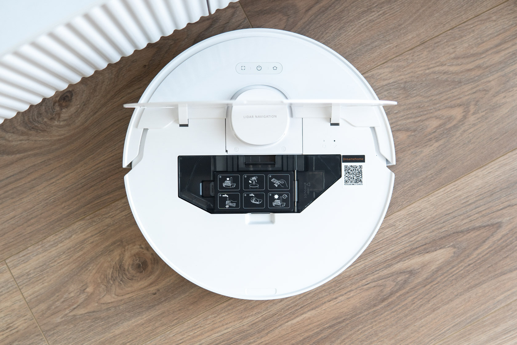 На фронтальной стороне базовой станции имеется специальная панель с текстурным покрытием, за которой спрятан объёмный мешок для сбора мусора. К ней есть постоянный доступ, а для наполнения водой отсеков для жидкости нужно открыть крышку сверху. А так как сама крышка плоская, её вполне можно использовать в роли подставки для чего-то не очень тяжёлого.