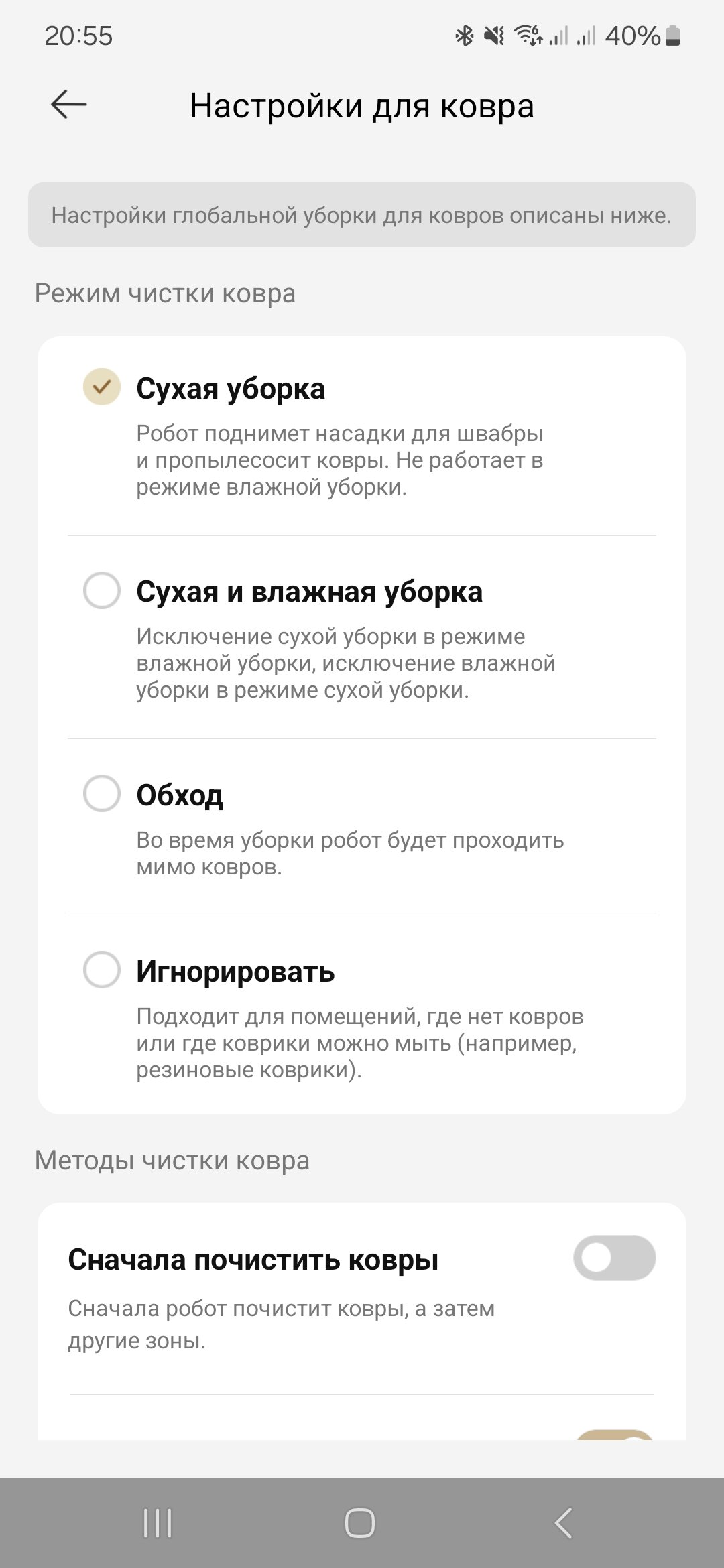 Естественно, Dreame L40 Ultra CE получил специальную защиту ковровых покрытий от намокания в процессе влажной уборки. Суть в том, что если система определит на пути следования ковёр, робот-пылесос поднимет швабры, выполняющие процесс влажной уборки, на высоту 10,5 мм. Этого предостаточно, чтобы избегать контакта с коврами даже с относительно длинным ворсом, не говоря уже о моделях с ворсом на 3-5 мм.