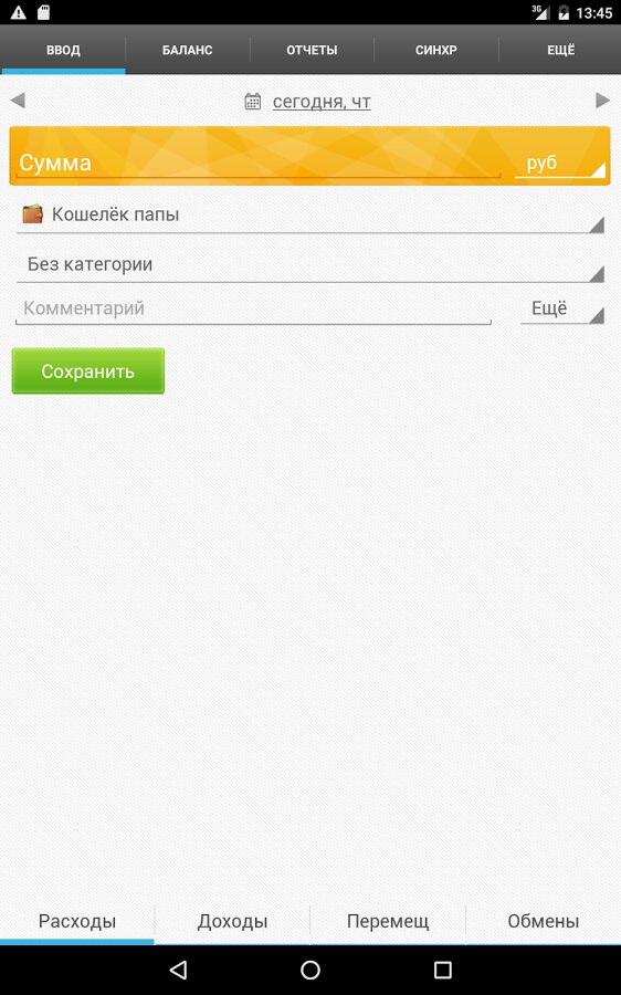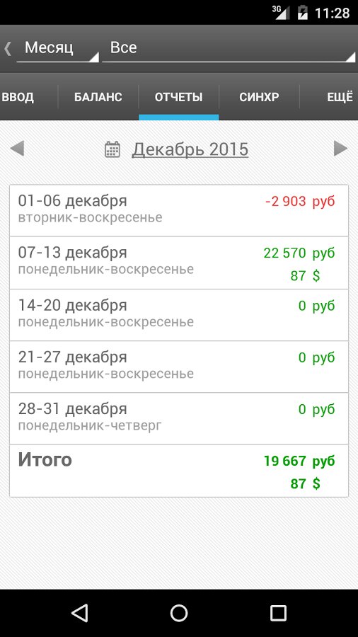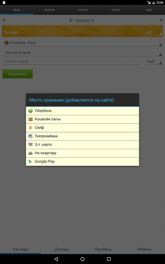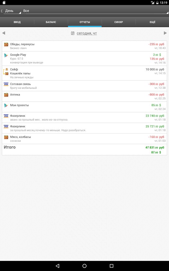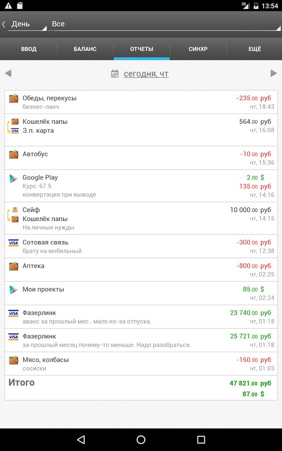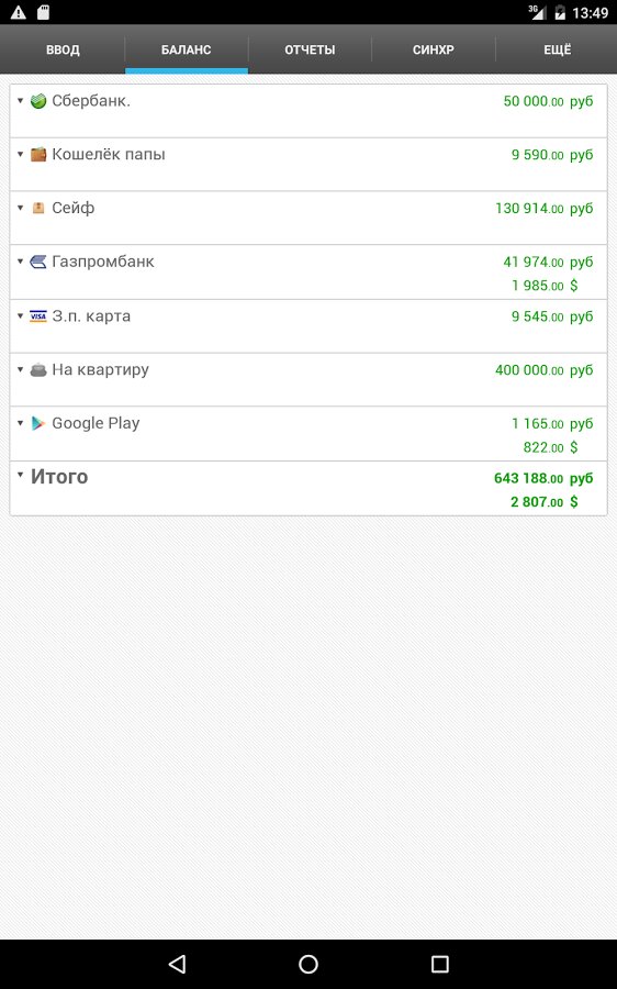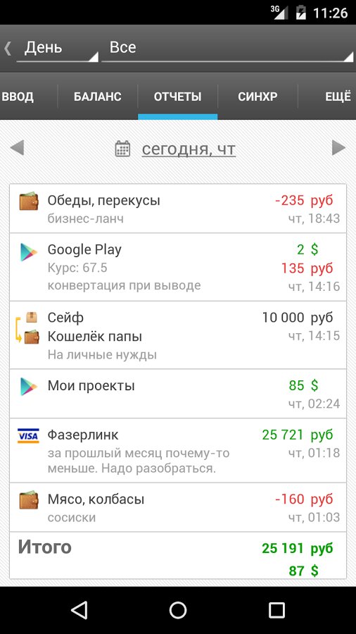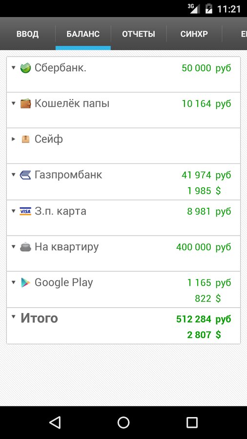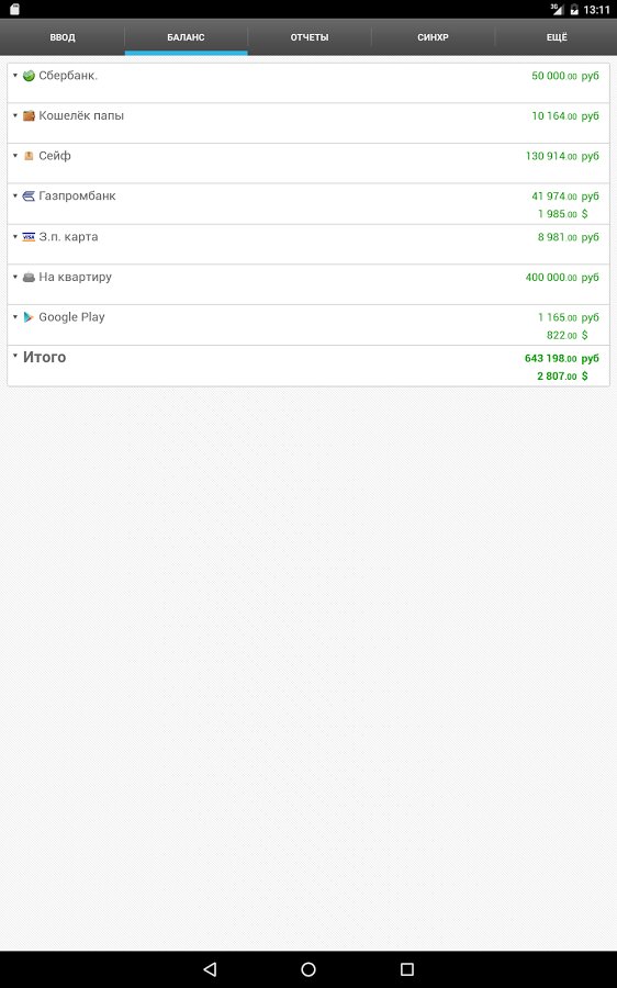 - Возможность вести домашнюю бухгалтерию в разных валютах, на разных счетах. Курсы валют автоматически обновляются при синхронизации с онлайн.