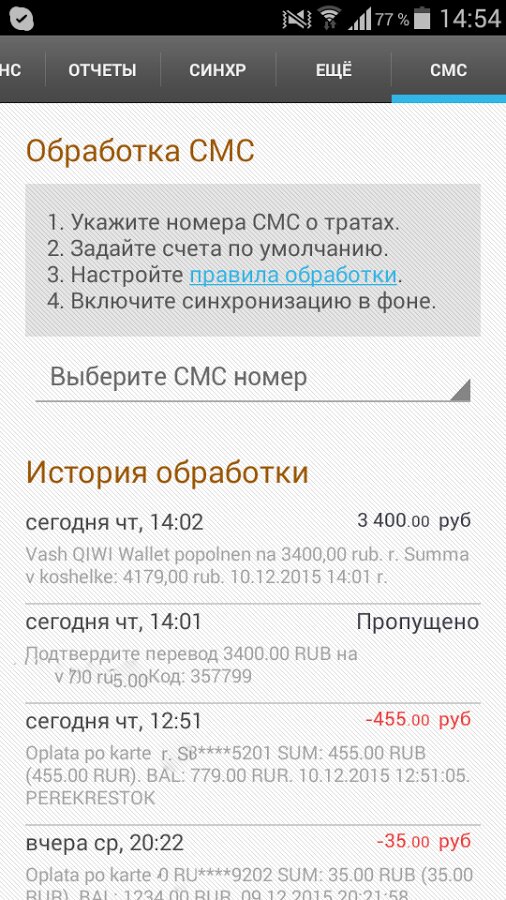 - Распознавание банковских СМС, автоматический ввод расходов в бухгалтерию. Собственные правила обработки.