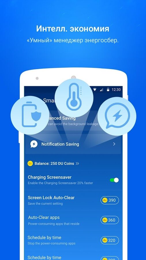 DU Battery Saver - продлевает жизнь батареи от одного заряда. Умный подход, за контролем вашей батареи. Умный и здоровый заряд батареи. Это прямые и основные функции DX Battery Booster. Отличает от аналогов, простой и удобный интерфейс и естественно, отличный мониторинг батареи и системы, по заявлению автора, аналоги во многом уступают ему.