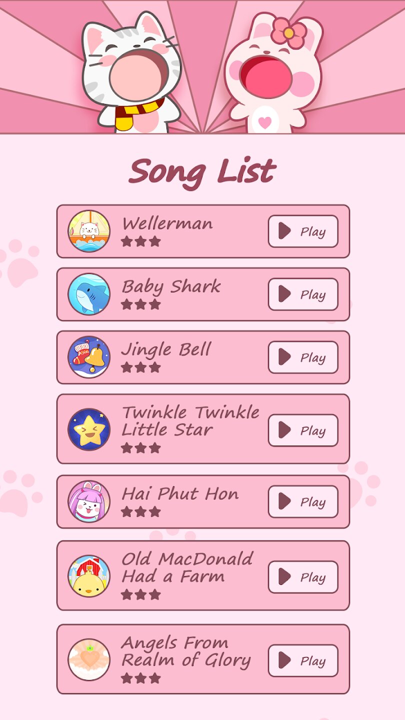 Основной игровой процесс предлагает вам нажимать в такт вместе с вашими пушистыми друзьями, исполняя гармоничные дуэты, которые требуют хорошей координации и чувства ритма. Посетите Animal Cafe, чтобы пополнить свою коллекцию поющих питомцев, каждый из которых имеет свой уникальный характер и музыкальный стиль. По мере прохождения игры вы будете участвовать в таких мероприятиях, как Bunny Pop, музыкальные сессии с питомцами и специальные коллекции виджетов, которые углубят вашу связь с этими очаровательными персонажами. В игре представлены успокаивающие ремиксы популярных песен, создающие спокойную и визуально привлекательную атмосферу.