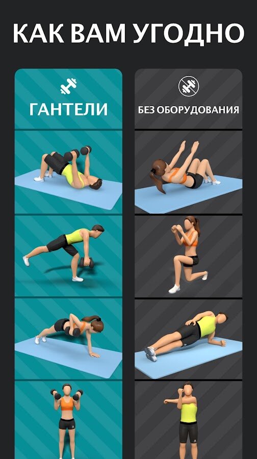 Сотни упражнений в приложении задействуют все крупные группы мышц, плечи, руки, грудную клетку, спину, пресс, ноги и т. д. Мы подготовили две базы упражнений: с гантелями и с весом тела. Тренер подберет для вас тренировку под выбранную цель, уровень подготовки и т. д. и составит личные планы занятий. А еще вы можете подстраивать занятия по бодибилдингу под свои нужды.