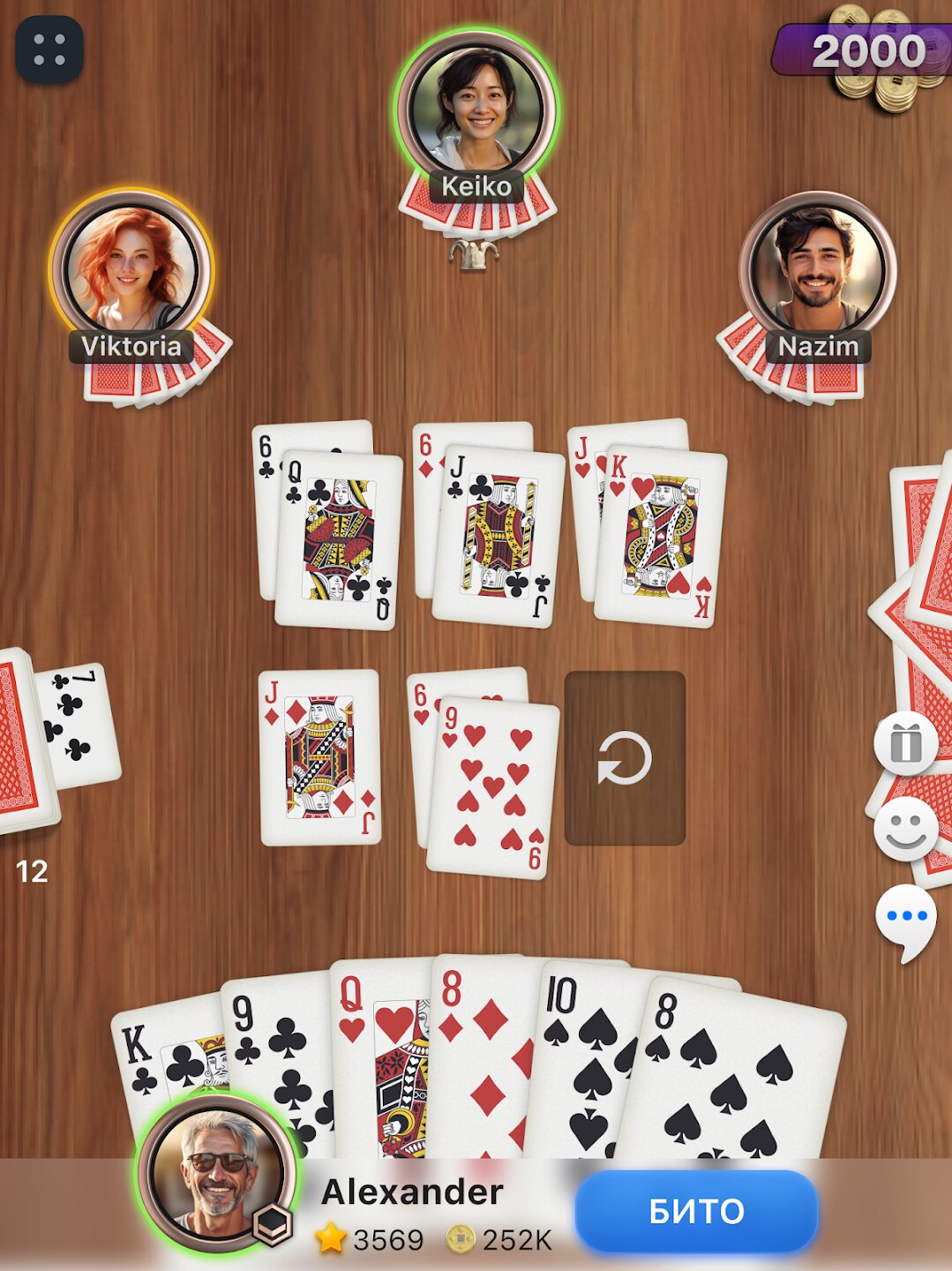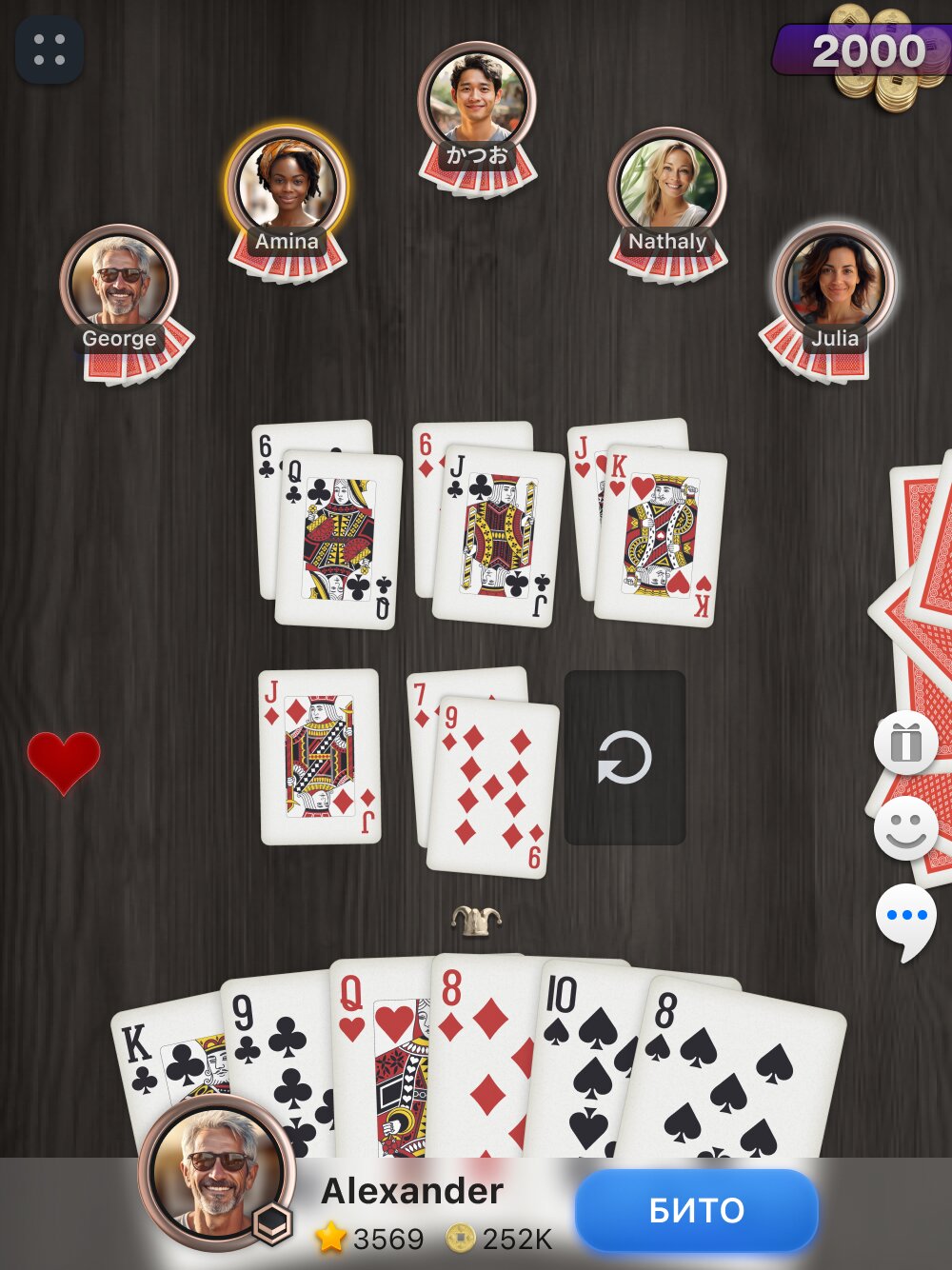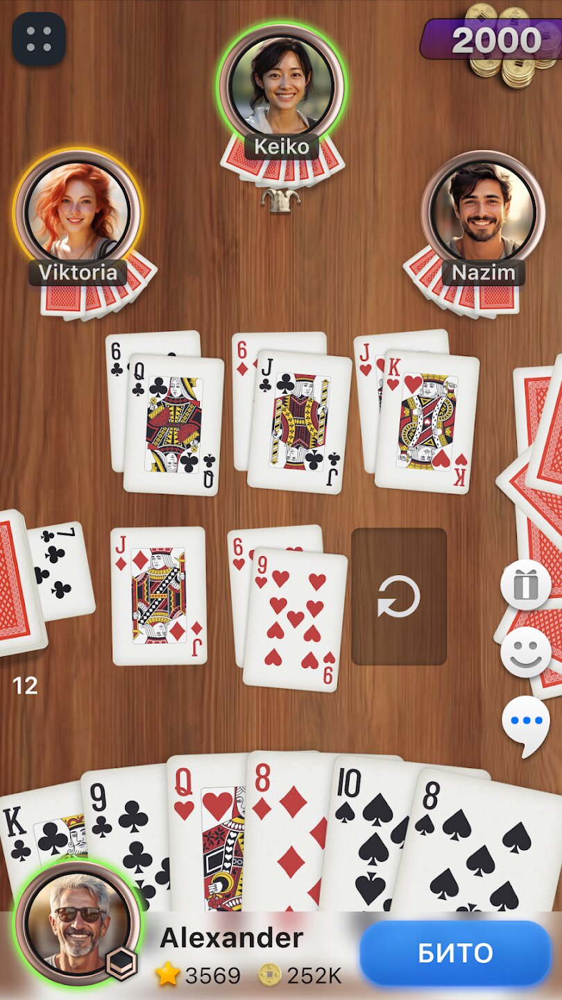 Durak Championship Online точно воссоздает аутентичный опыт игры в Подкидной и Переводной Дурак с игроками со всего мира. Интерфейс разработан с учетом ясности и простоты использования, что позволяет вам полностью сосредоточиться на своей стратегии. Присоединяйтесь к рейтинговому матчу, чтобы проверить свои навыки против соперников аналогичного уровня, или создайте частный стол, защищенный паролем, для игры с друзьями. Игра поддерживает столы от 2 до 6 игроков, предлагая динамичный и социальный опыт игры в карты.