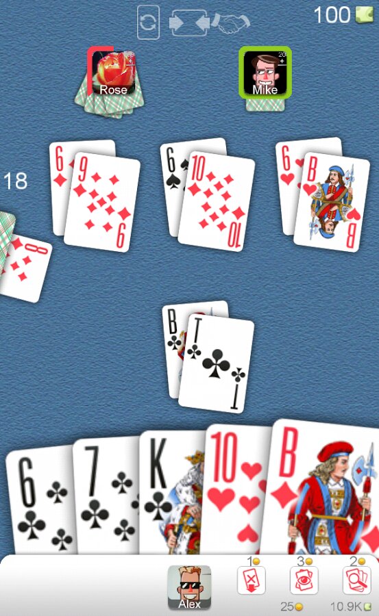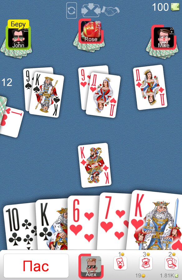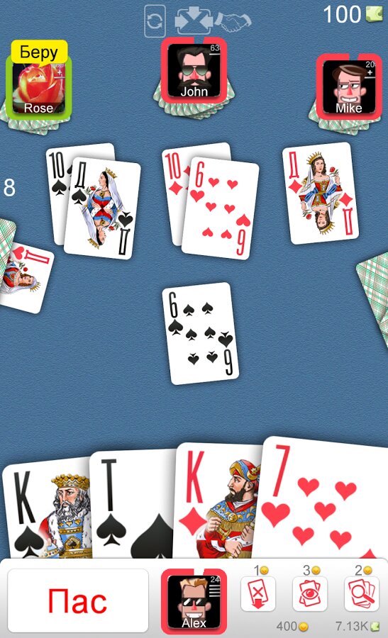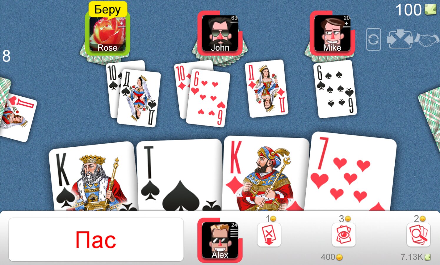 Дурак онлайн – любимая всеми карточная игра. Цель игры — избавиться от всех карт в руке. Игроки, которым удалось избавиться от карт, получают вознаграждение — часть кона. Последний игрок, оставшийся с картами, проигрывает. Также игрок считается проигравшим, если он преждевременно заканчивает игру (сдается или не сделает ход).