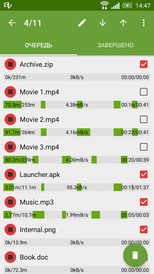 - нажатие по запущенной закачке останавливает ее;