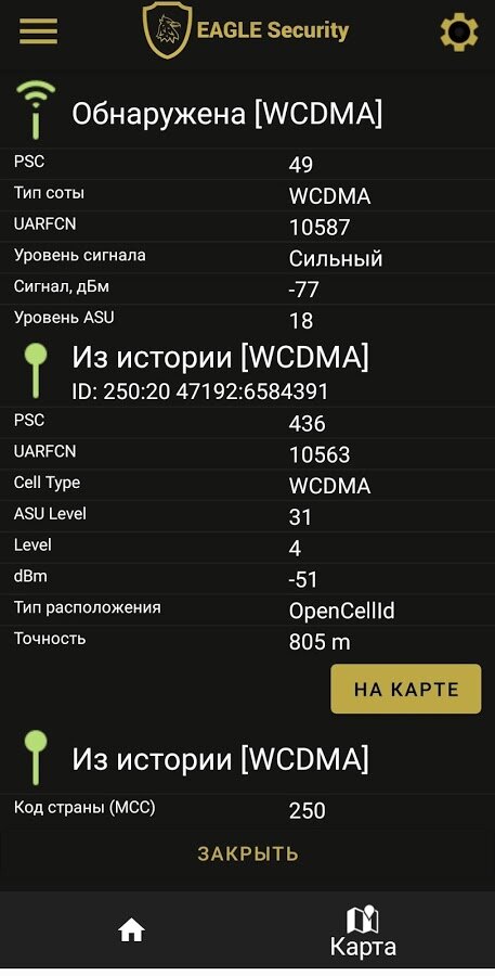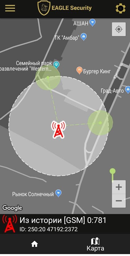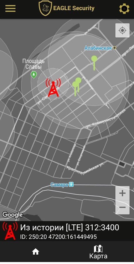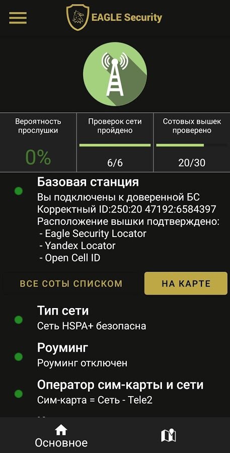 - Способ защиты: отслеживание идентификаторов базовых станций, к которым подключается телефон. Eagle Security проверяет сигнатуру станции, у многих комплексов прослушки она не соответствует стандартам для России, а также отслеживает расположение станций. Если какая-то базовая станция перемещается по городу, либо периодически пропадает со своего места, она отмечается как подозрительная, Eagle Security уведомляет об этом пользователя.Такая ситуация не гарантирует, что вас прослушивают, но рекомендуется воздержаться от разговоров по телефону и от отправки сообщений, когда ваш телефон подключен к сомнительной базовой станции.