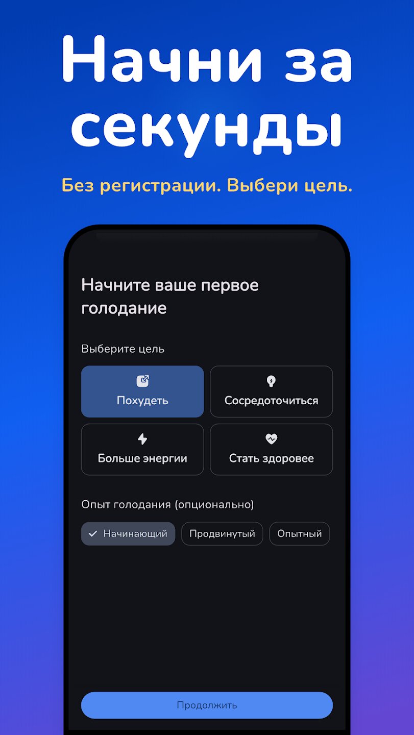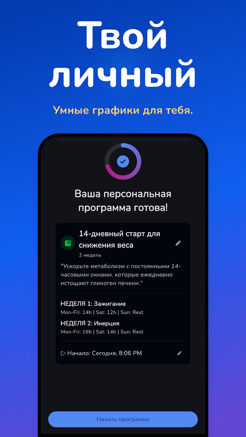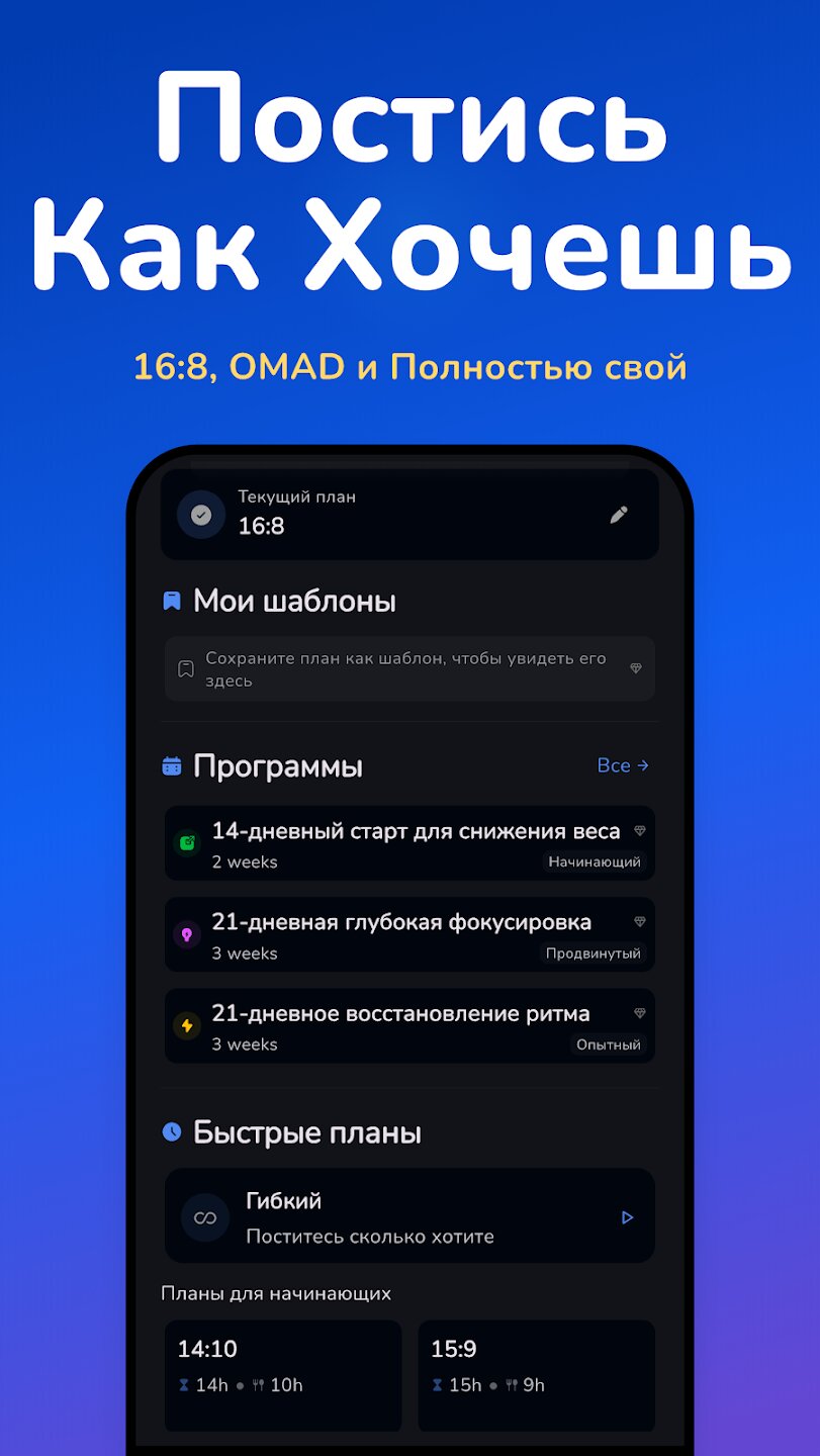 - Простой таймер для популярных ежедневных протоколов голодания (например, 16:8, 18:6).