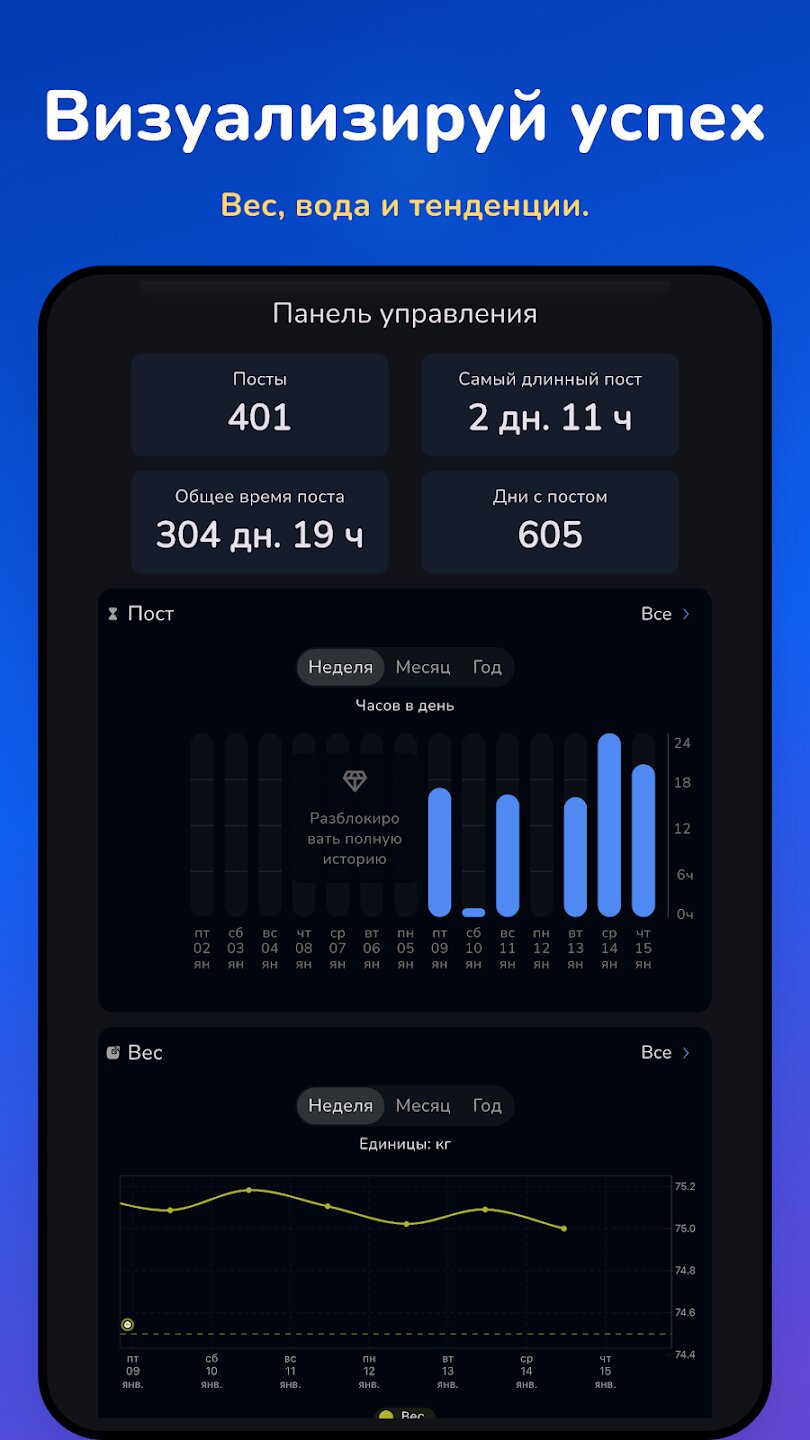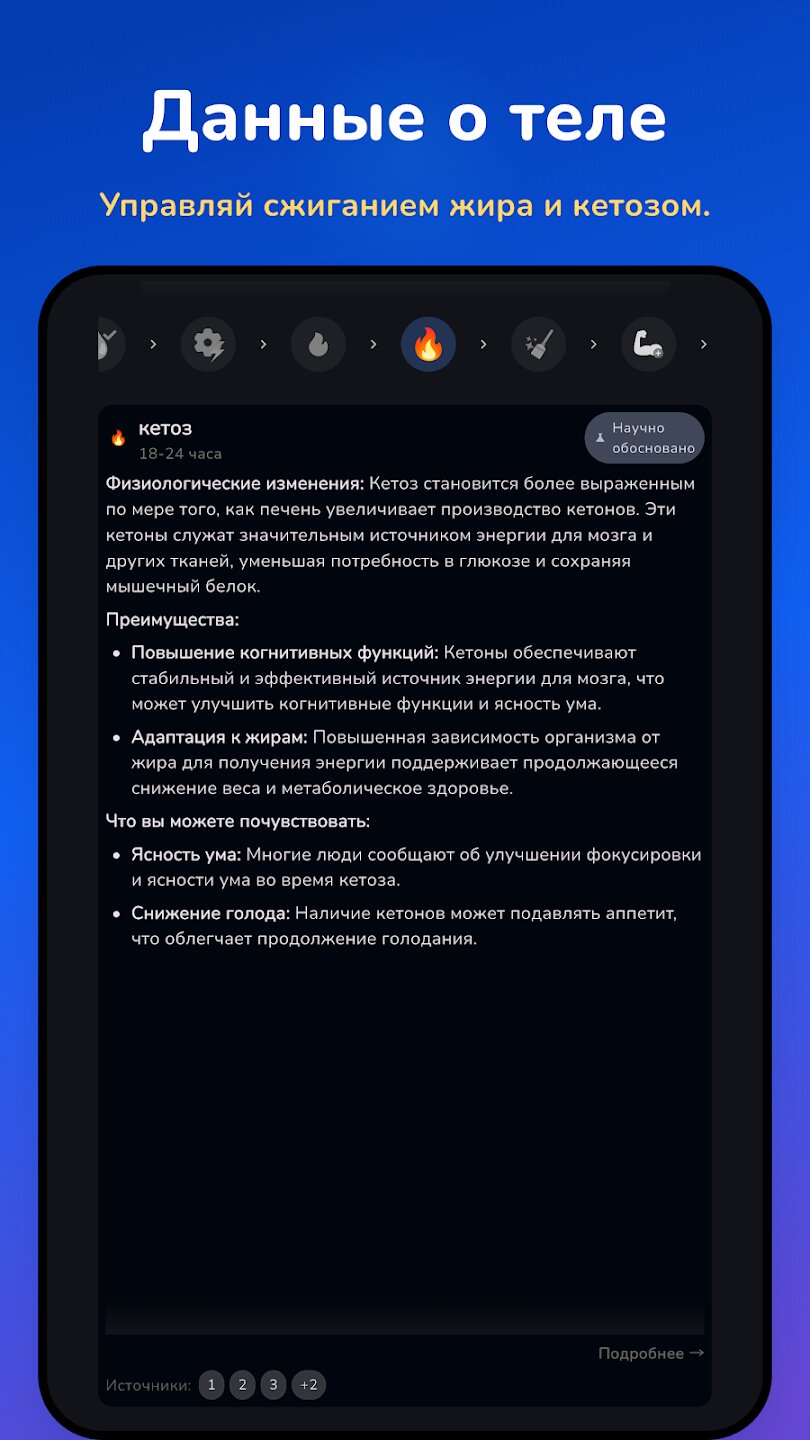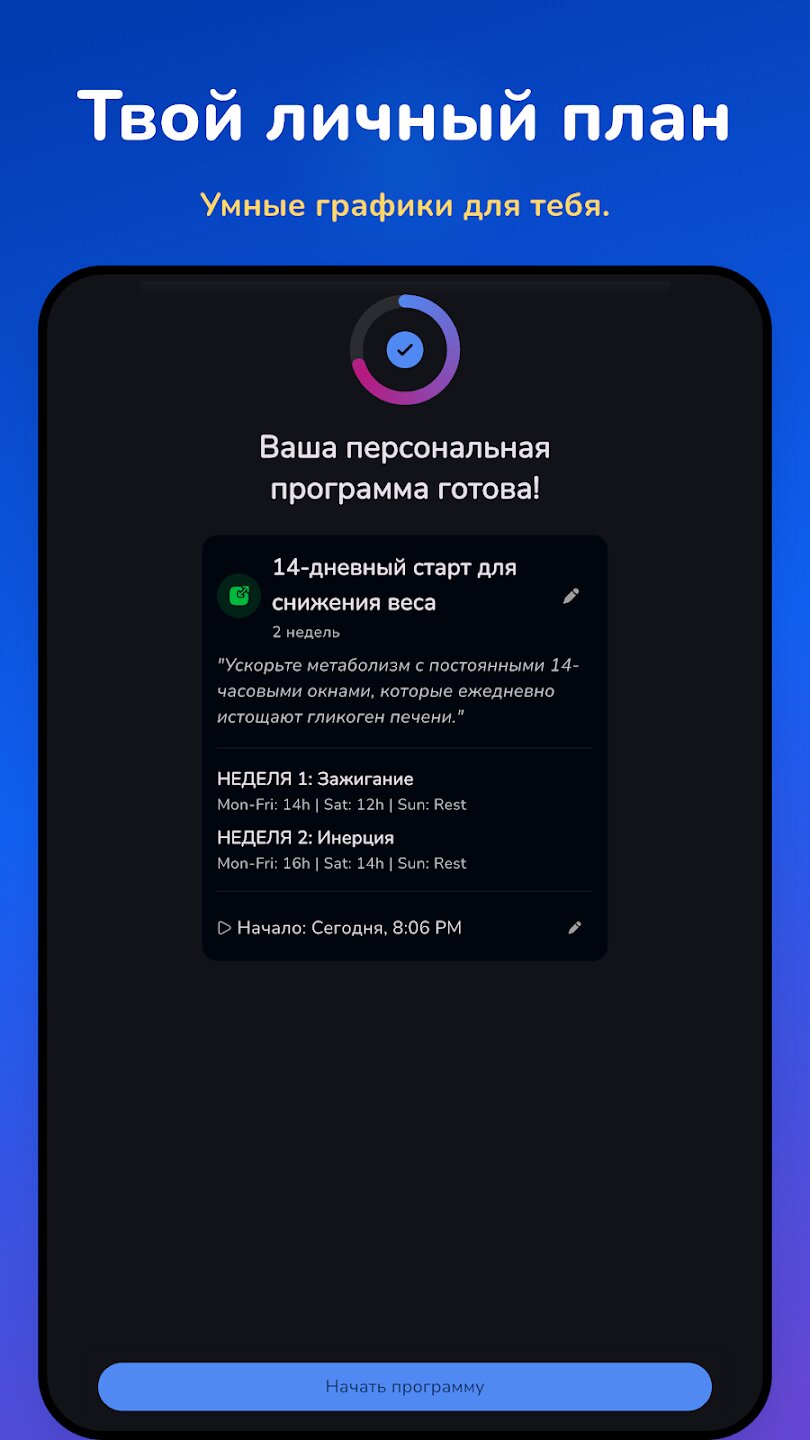 - Простой таймер для популярных ежедневных протоколов голодания (например, 16:8, 18:6).