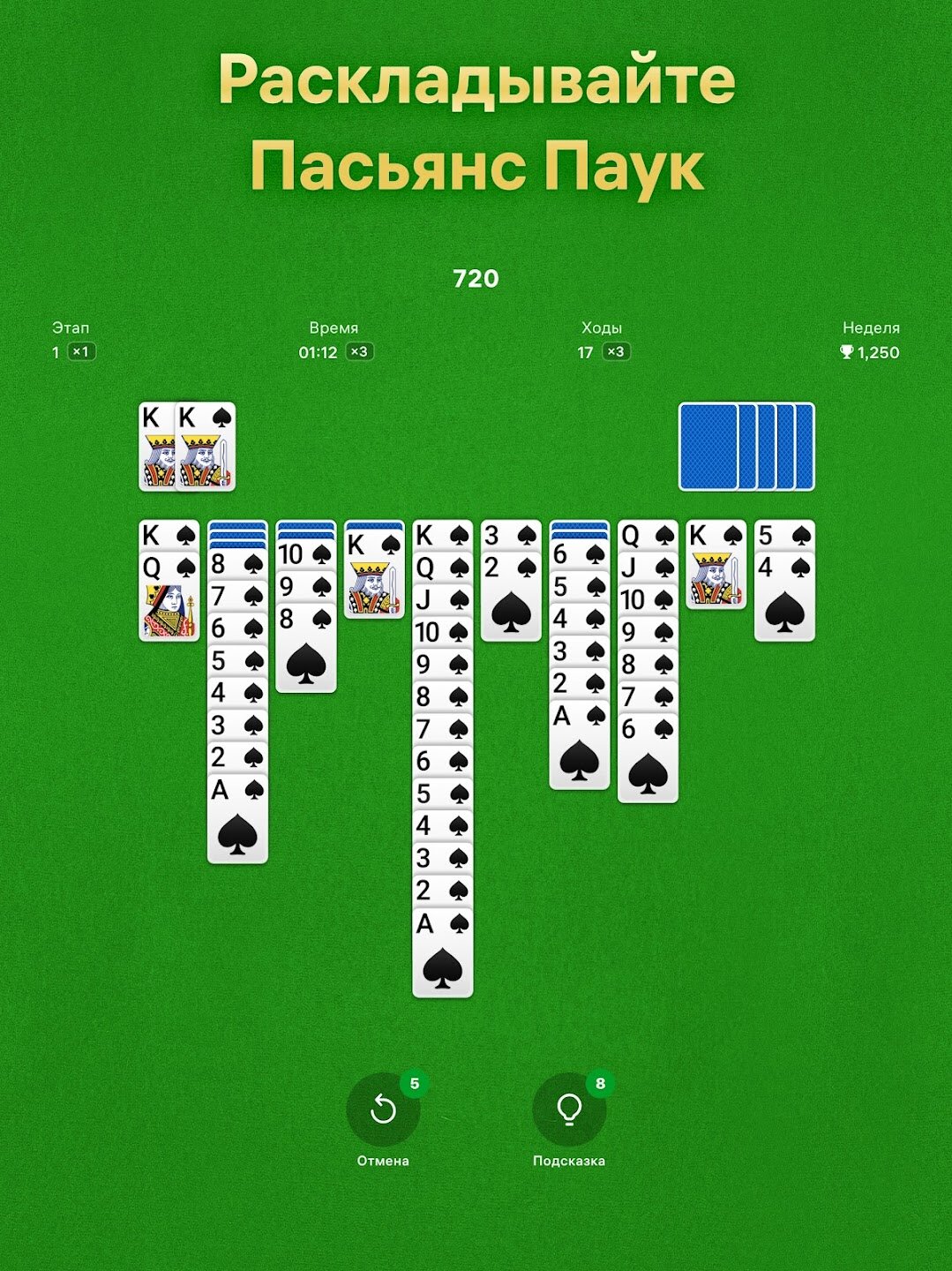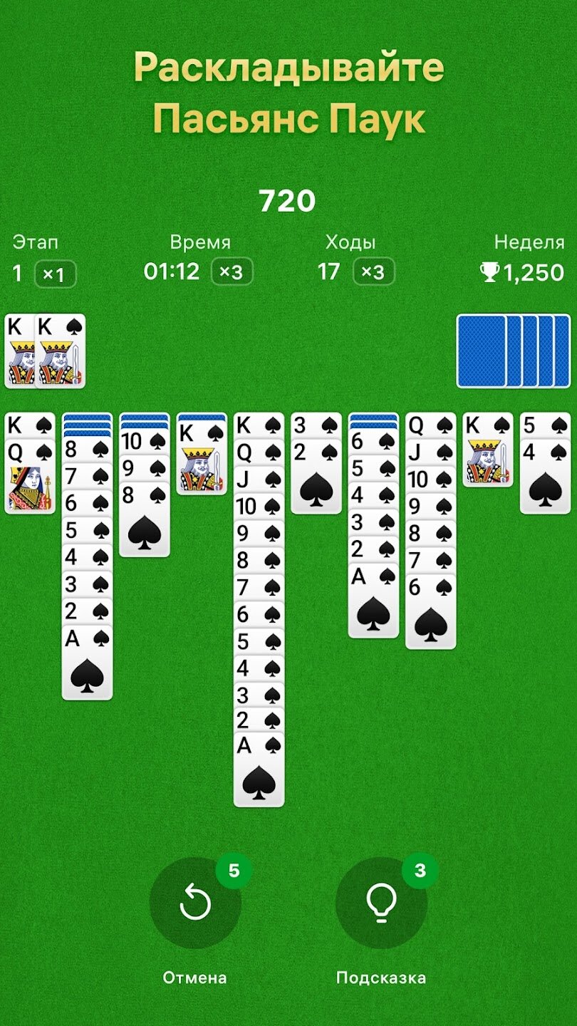 Пасьянс Паук — это неподвластная времени и популярная классическая карточная игра, которая сочетает в себе оригинальные правила пасьянса с захватывающими новыми функциями для мобильных устройств. Эта бесплатная карточная игра с понятным и интуитивным интерфейсом приглашает вас проверить свои навыки, проходя уровни и устанавливая новые рекорды в одной из самых любимых игр в пасьянс всех времен.