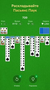 - Классический игровой процесс пасьянса «Паук» с вариантами сложности на 1, 2 или 4 масти.