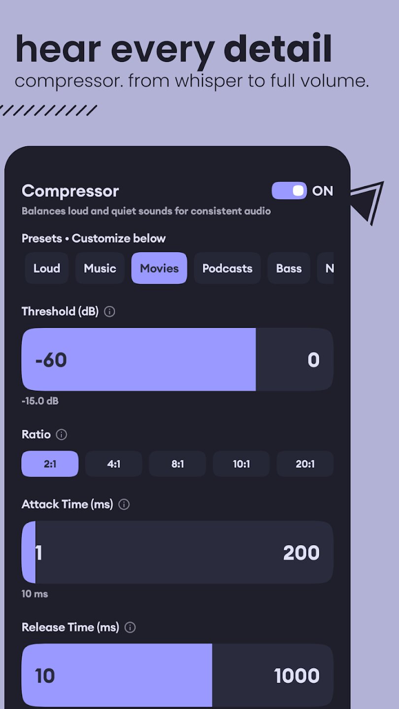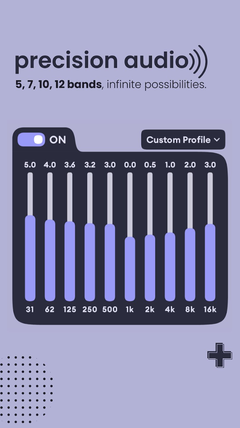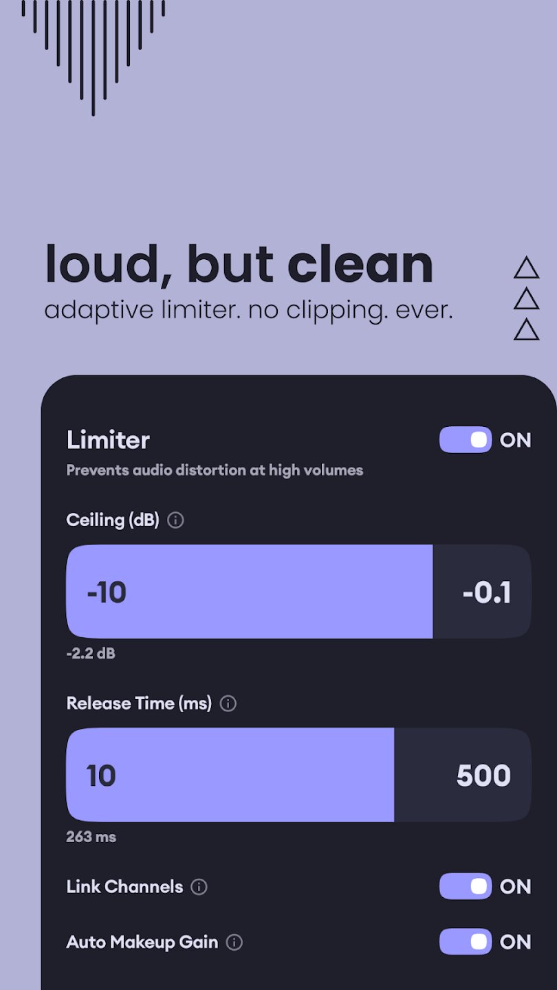 Приложение предоставляет вам полный контроль над вашим звуковым профилем. Вы можете точно настроить частоты с помощью профессионального 10-полосного эквалайзера, чтобы добиться мощных басов, сверкающих высоких частот или идеально сбалансированного звука для любого жанра. Усовершенствованный ограничитель предотвращает искажения даже при высокой громкости, позволяя вам усилить звук, сохраняя при этом чистоту студийного качества. Встроенные пресеты для поп-музыки, рока, джаза, EDM и классической музыки обеспечивают мгновенную оптимизацию, а пользовательские профили позволяют сохранять ваши идеальные настройки.