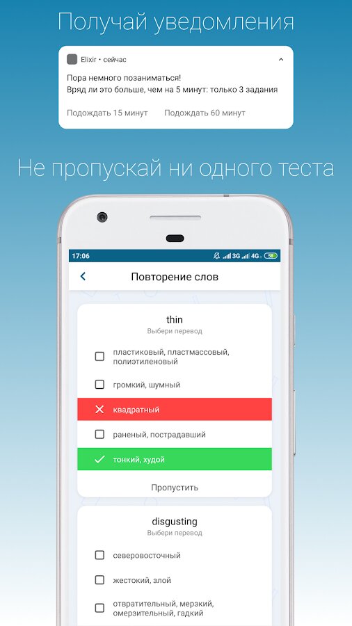 Изучение английского языка с Elixir превращается в естественный процесс: английские слова сами запоминаются благодаря умным алгоритмам подбора и научному методу интервальных повторений. Elixir берёт на себя все организационные моменты — ты будешь учить английский язык, обо всём остальном позаботится приложение: даст тебе нужные задания и пришлёт уведомления, когда те появятся! Благодаря тесту на уровень английского языка ты узнаешь свой уровень и будешь учить только подходящие английские слова!