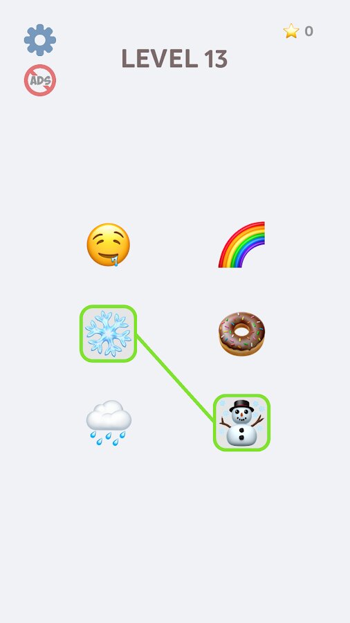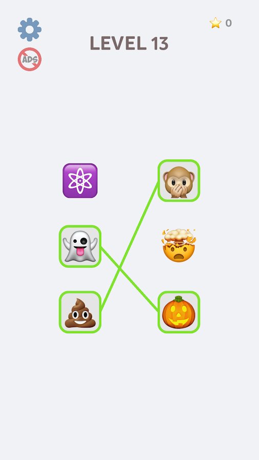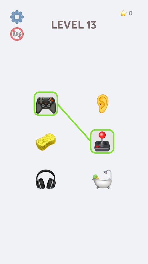 Новая игра на воображение, в которой вам нужно соединять пары эмодзи которые ассоциируются. Подумайте и найдите решение каждой головоломки. Просто нажимайте один за другим элементы из разных столбцов, чтобы соединить их линией. Или перетащите, чтобы нарисовать линию и соединить элементы из разных столбцов. Если правильно соединили все элементы - уровень пройден. Это сложнее, чем вы думаете!