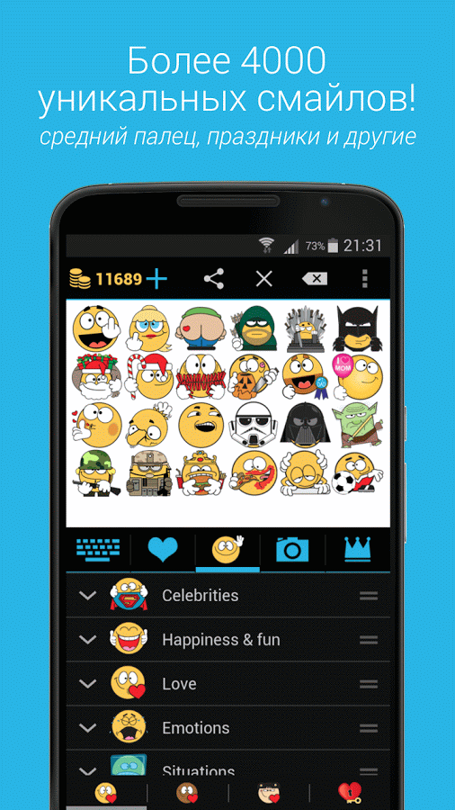 - Хочешь новый смайлик в следующем обновлении приложения? Отправь бесплатный запрос автору прямо из приложения!