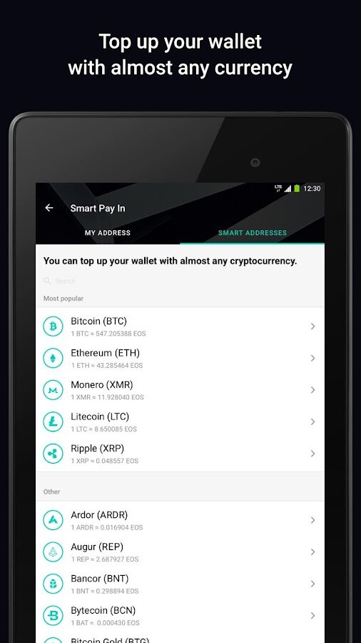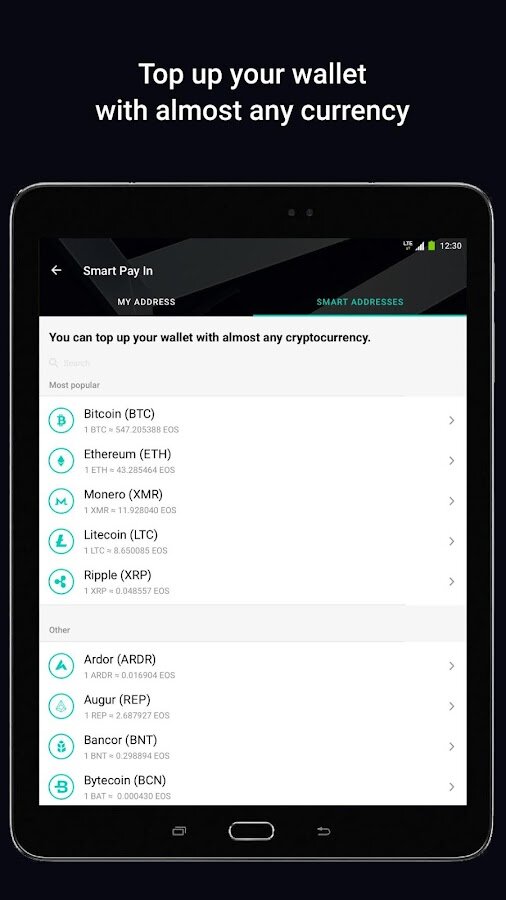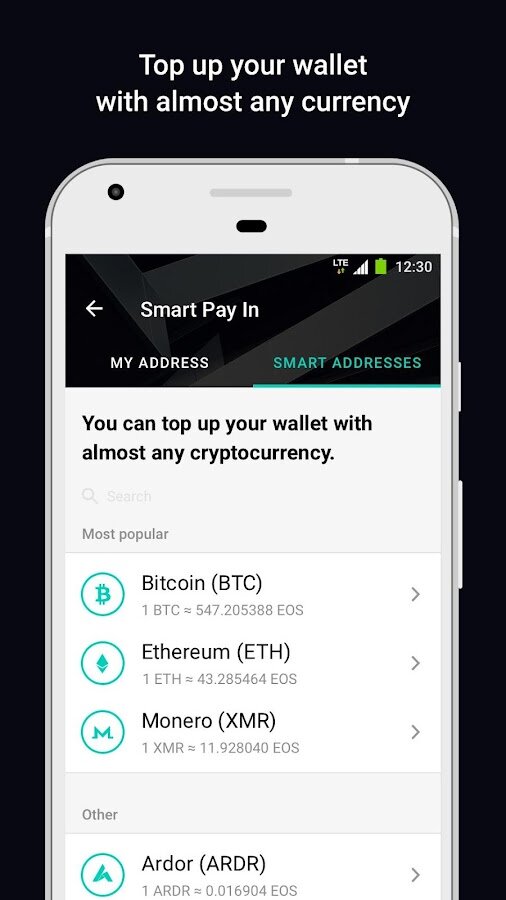 - Обмен криптовалют. Вы можете пополнить ваш баланс почти любой криптовалютой и она автоматически сконверируется в EOS. Делайте безопасные транзакции на адрес любого альткоина. Все транзакции внутри сети EOS 100% бесплатные. Отслеживайте ваш баланс и актуальный обменный курс в фиате с помощью графиков в реальном времени.