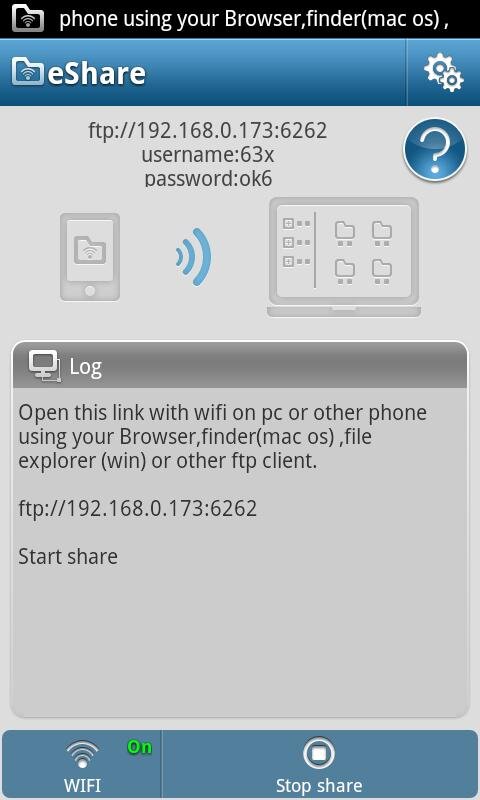 eShare — приложение для передачи файлов с помощью протокола FTP. Есть возможность указать папку, в том числе и из памяти телефона, проверка подлинности.