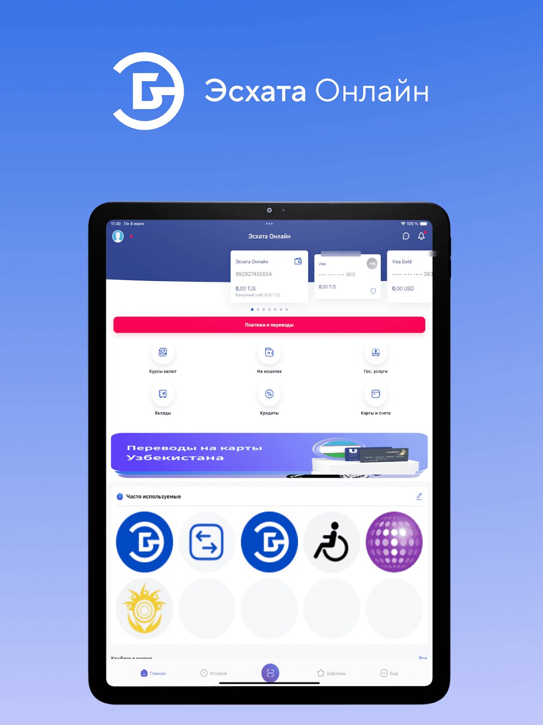 Никаких очередей, бумаг и выходных. С мобильным приложением Эсхата Онлайн вы можете с любого места и в любое время оплачивать товары и услуги, а также совершать банковские операции в режиме онлайн.