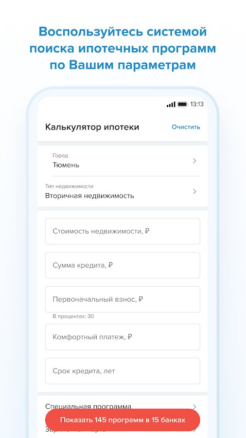 - В приложении работает калькулятор ипотеки, который учитывает предложения всех банков-партнеров. Укажите нужную сумму, заполните дополнительные поля, и система покажет все подходящие программы. А еще выделит предложения со скидкой — самые выгодные. Сможете подать заявку онлайн сразу в несколько банков — просто оставьте номер телефона в форме обратной связи.