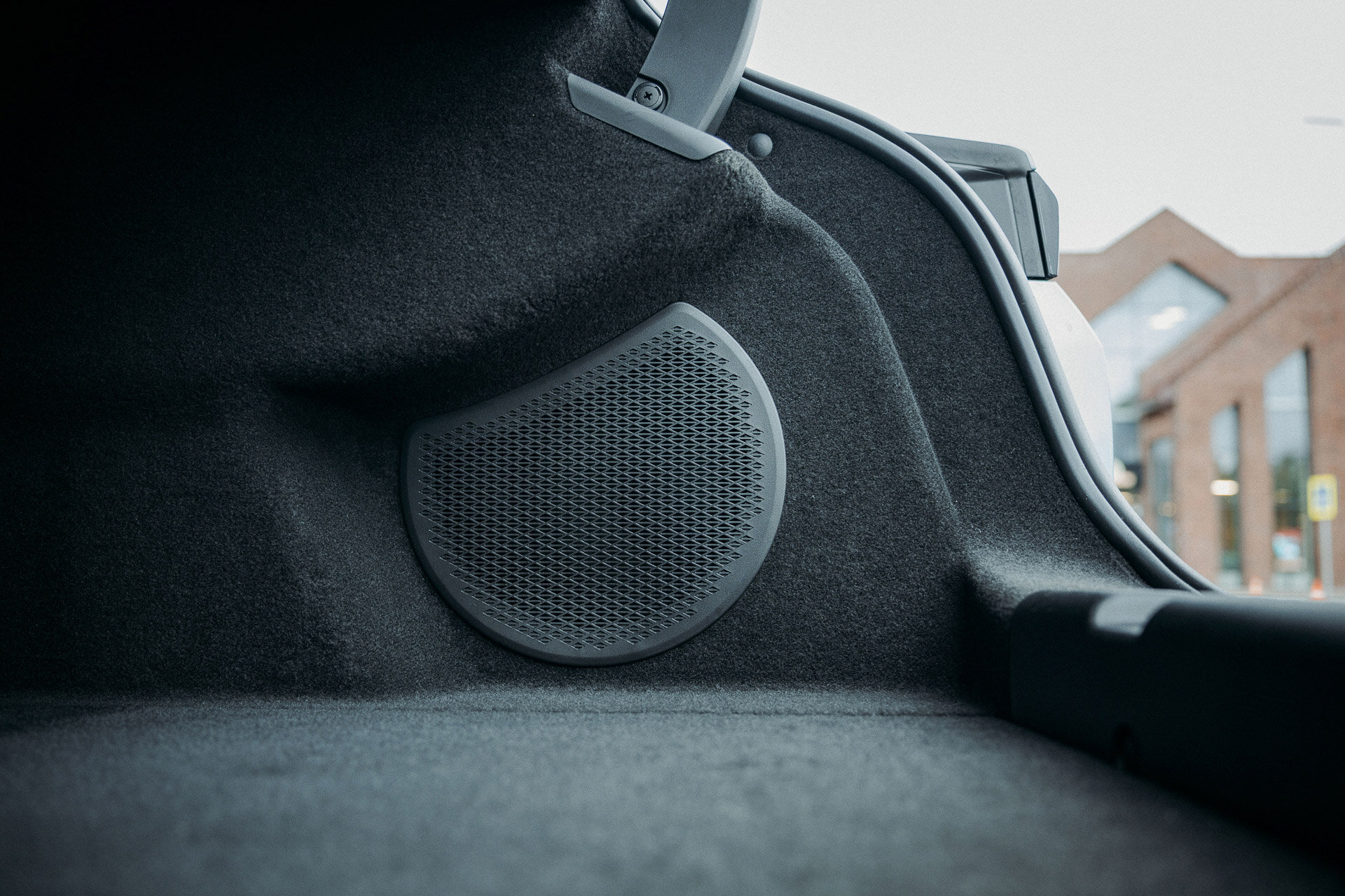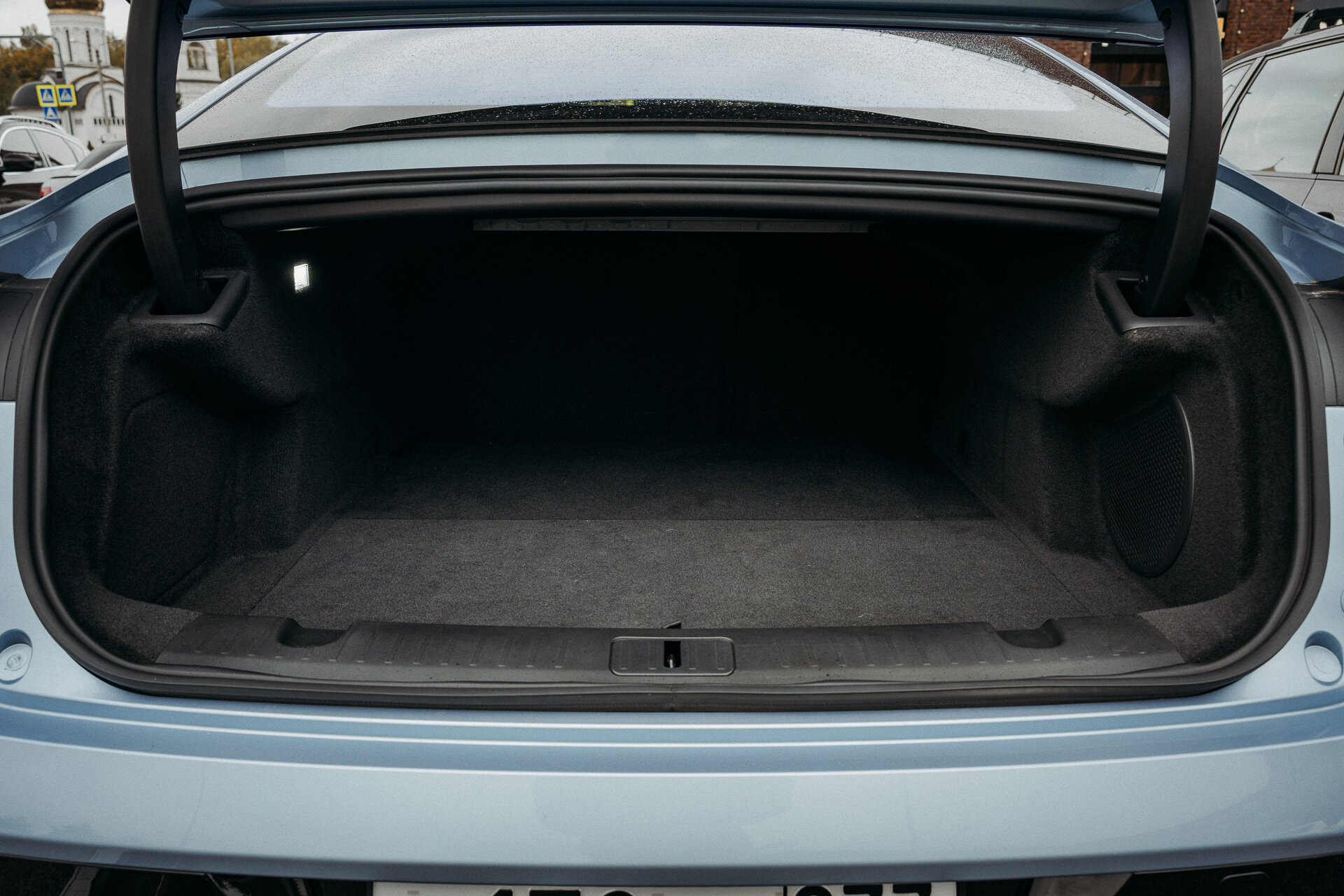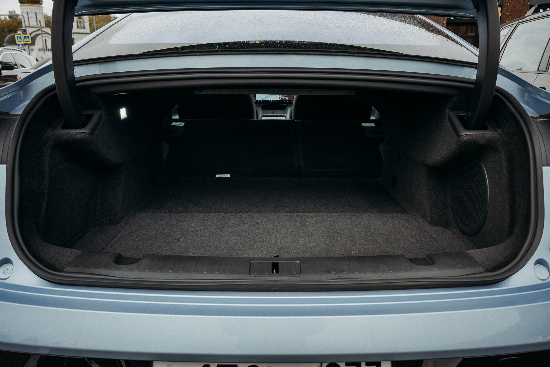 Пробегусь по аспектам практичности. Начну я с багажника. Попасть в него можно с брелока, внезапно (учитывая тенденцию отказа от физических кнопок) с кнопки над логотипом и через шторку меню. Объём солидный — 400 литров. Но помимо лампочки внутри нет вообще никакого оснащения. Лишь в правой части притаился саб-вуфер и имеется розетка на 12 вольт.