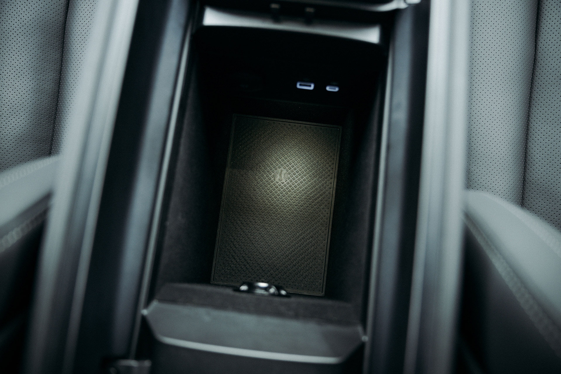Что же у нас имеется? В целом-то всё стандартно, и даже несколько похоже на Omoda C7. Но всё в угоду визуального минимализма. Два ложе под смартфон, хотя в премиальном автомобиле, коим видят Exlantix маркетологи, хочется видеть две беспроводные зарядки… Ниже под шторкой тесные фиксаторы тары и небольшая ниша под мелочёвку.