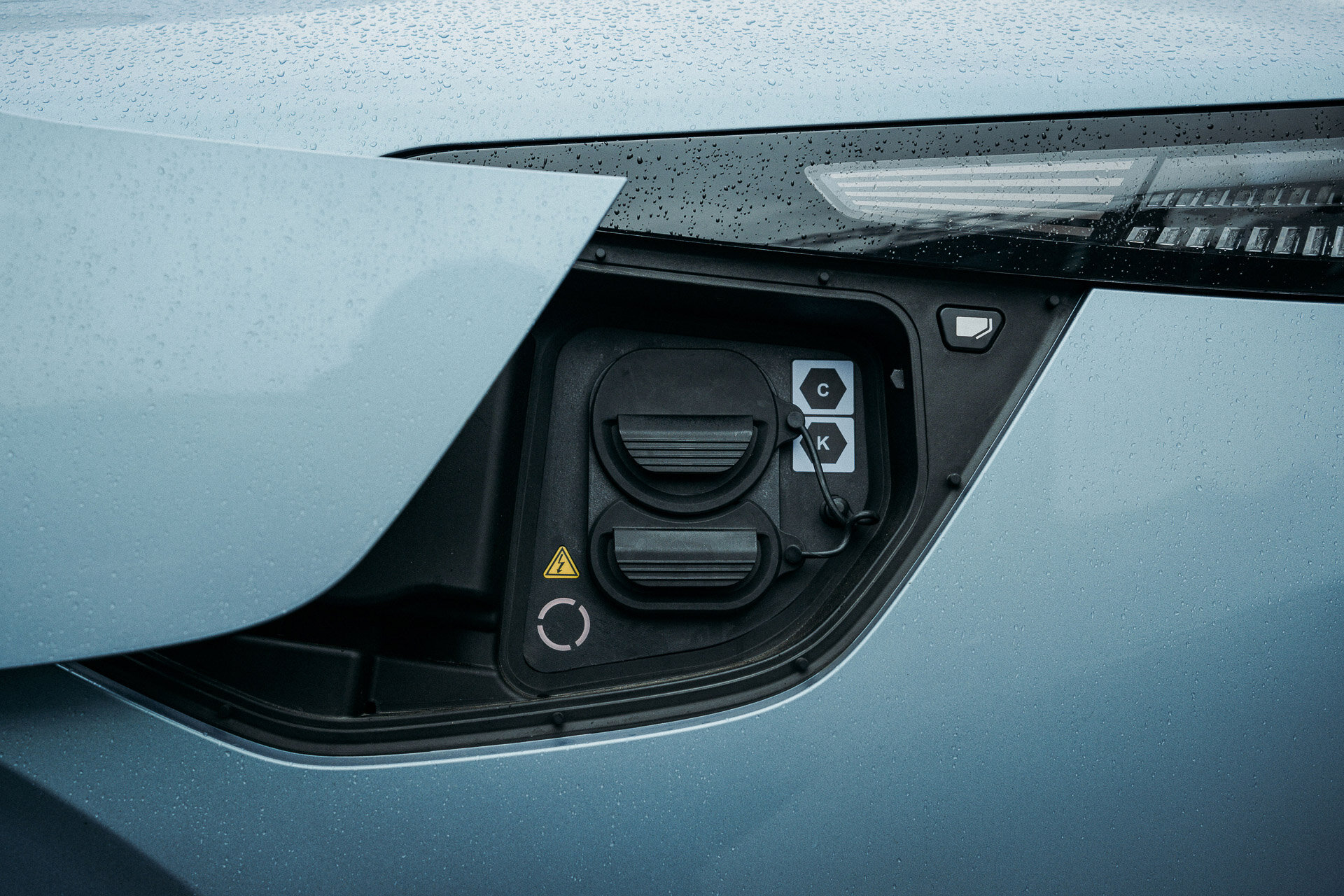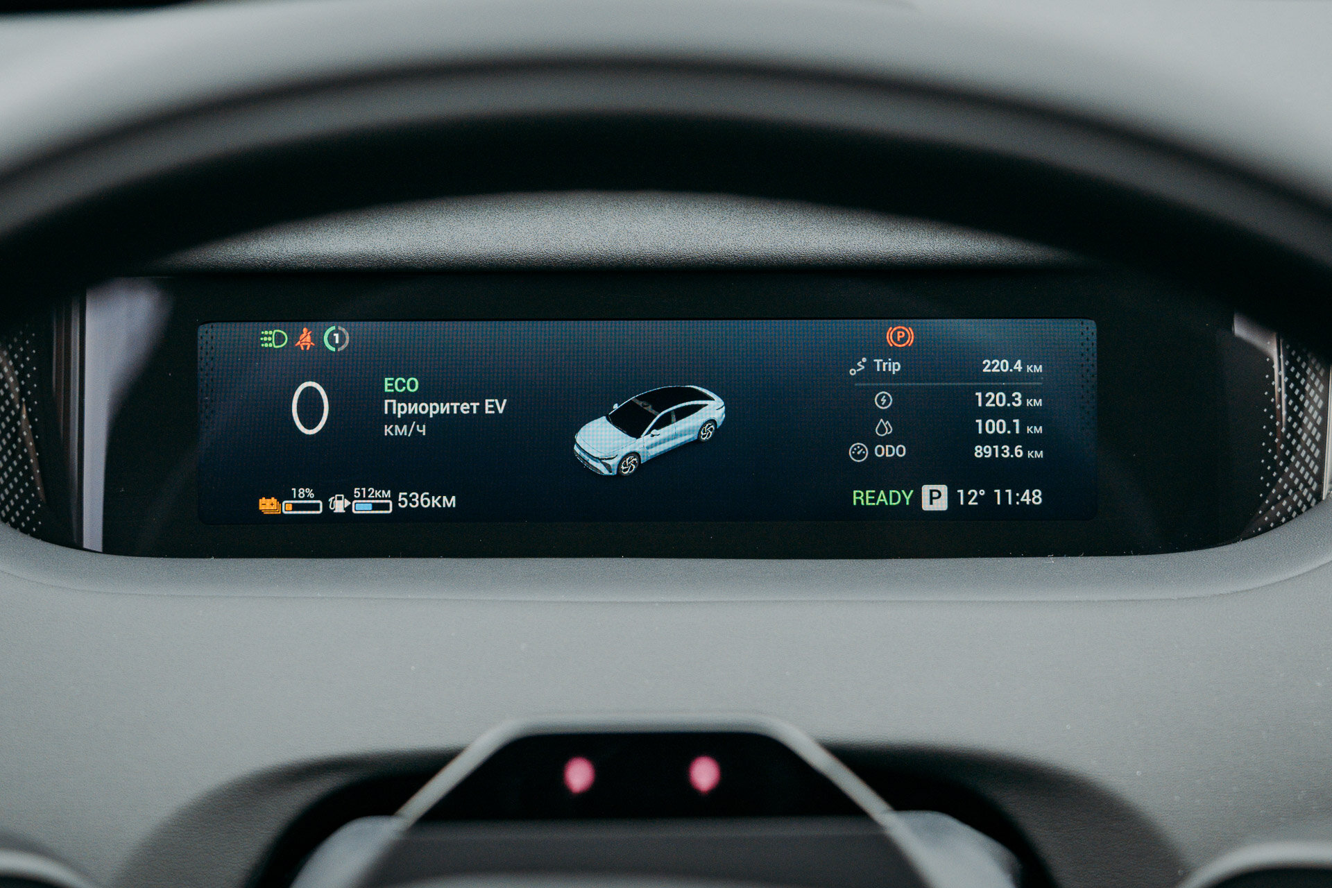 Гибрид. Это важно держать в голове, садясь за руль. Первое, где это можно заподозрить, — две шкалы запаса хода, собственно на батарее и на бензине. Ну ещё два лючка на кузове автомобиля (розетка слева, бензобак справа). Здесь я ловлю себя на мысли, что это двойная психологическая нагрузка, ведь у вас кончаются два ресурса одновременно…