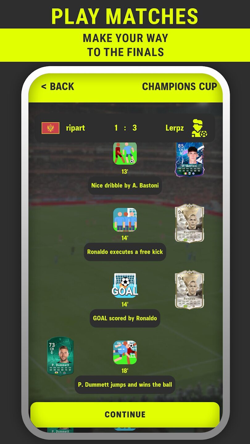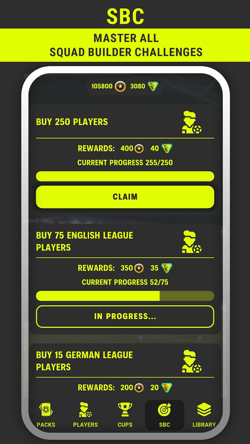 Примите участие в напряженных турнирах с вашей собственной командой против реальных соперников со всего мира. Сражайтесь за славу, выигрывайте престижные кубки и поднимайтесь в рейтинге, чтобы оставить свой след в истории. Игра постоянно проверяет ваши менеджерские навыки с помощью увлекательных испытаний Squad Builder Challenges (SBC), в которых вы должны решать сложные головоломки, создавая определенные команды, чтобы заработать уникальные и ценные награды, которые укрепят ваш клуб.