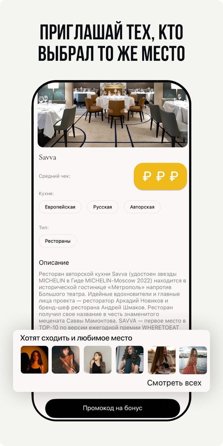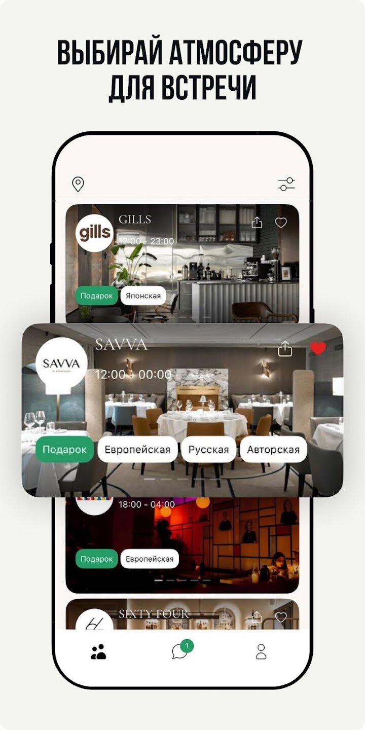 - Поиск партнеров по местоположению через рестораны и кафе.