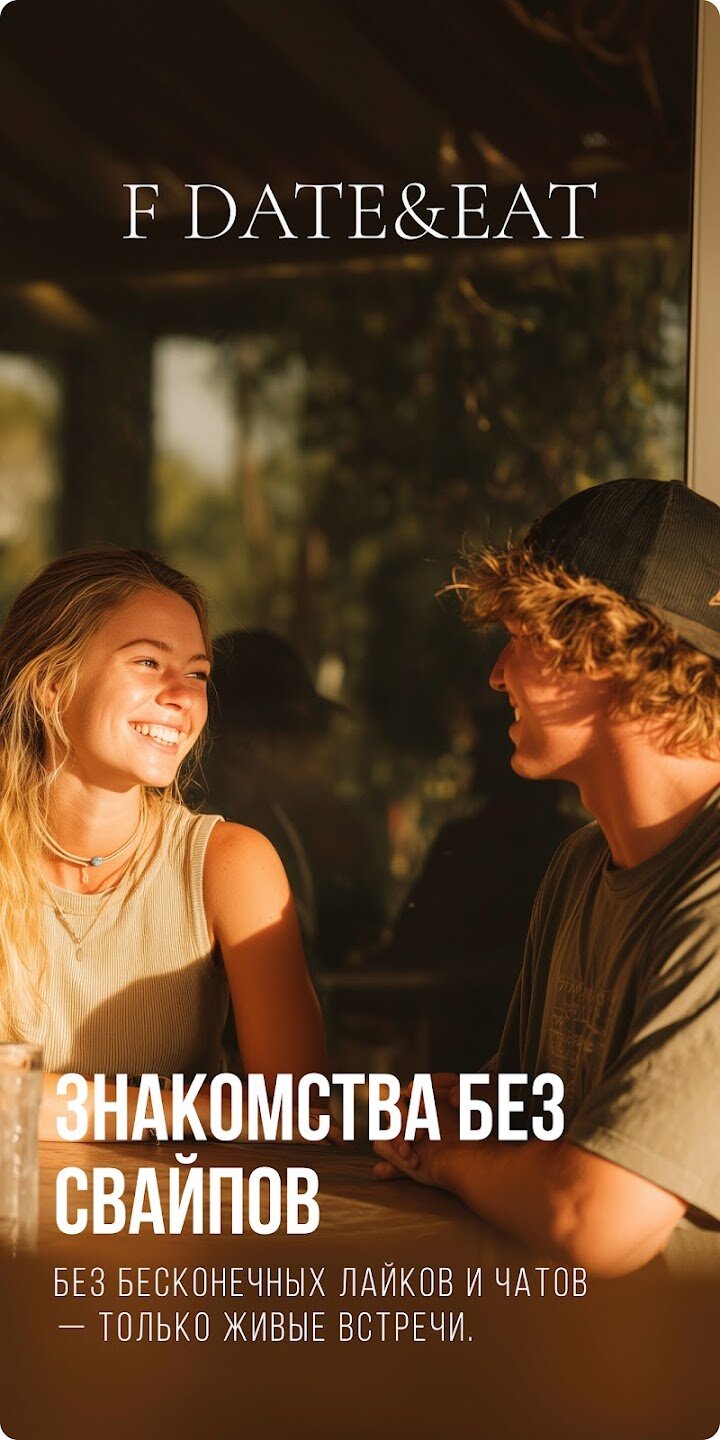 Знакомства рядом F Date&eat — это революционное приложение для знакомств, которое объединяет людей через местные кафе, бары и рестораны, а не бесконечные свайпы.