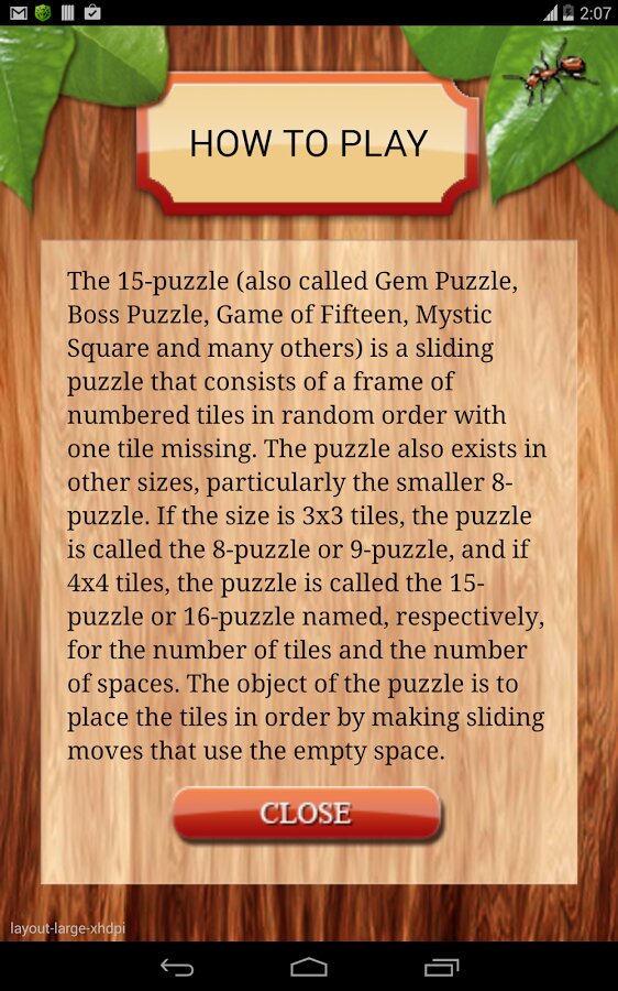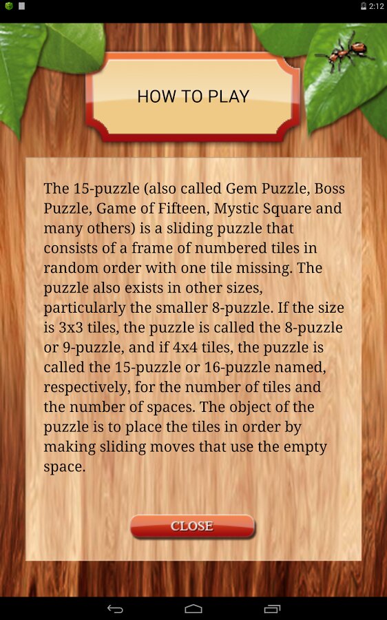 Fifteen classic — это классическая головоломка, знакомая с детства по названию «пятнашка». Головоломка «пятнашка» была придумана еще в конце 19 века в США. Классическое игровое поле представляет собой матрицу 4х4 клеток, на котором по порядку (слева — направо и сверху — вниз) располагаются цифры от 1 до 15. Последняя клетка – пустая. Клетки перемешиваются определенным образом, и задача игрока состоит в том, чтобы восстановить их первоначальное правильное расположение. Делать это можно лишь путем перемещения на пустую клетку другой, соседней с ней клетки (расположенной слева, справа, сверху или снизу от пустой).