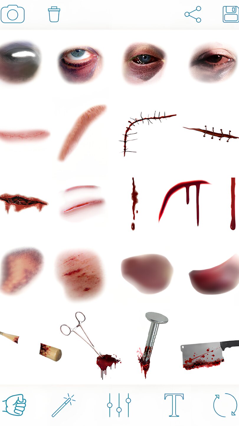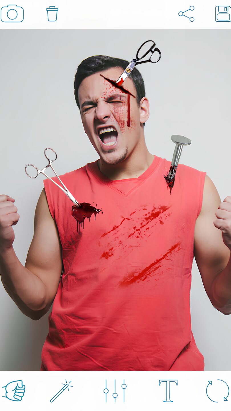 Создавайте драматичные образы всего за несколько клитов. Выбирайте из обширной коллекции стикеров: глубокие порезы, свежие синяки, кровоподтеки и шрамы. Каждый элемент тщательно проработан для максимальной реалистичности. Приложение позволяет настраивать размер, прозрачность и расположение каждого эффекта, чтобы интеграция с фотографией выглядела естественно.