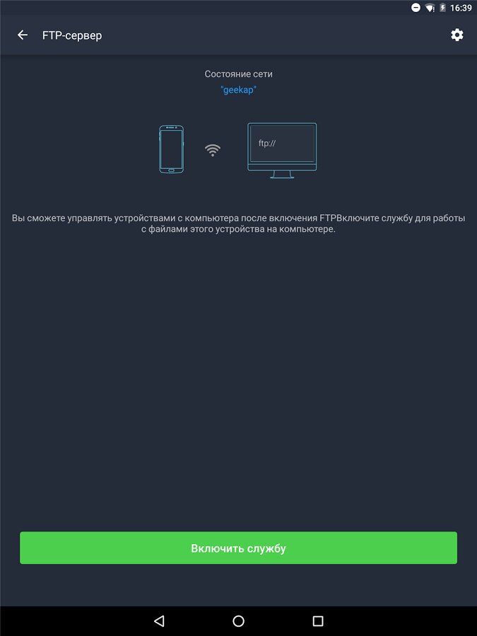 - встроенный HTTP- и FTP-сервер, дающий возможность получать доступ к выбранным папкам на Android-смартфоне с локального ПК через беспроводное соединение;