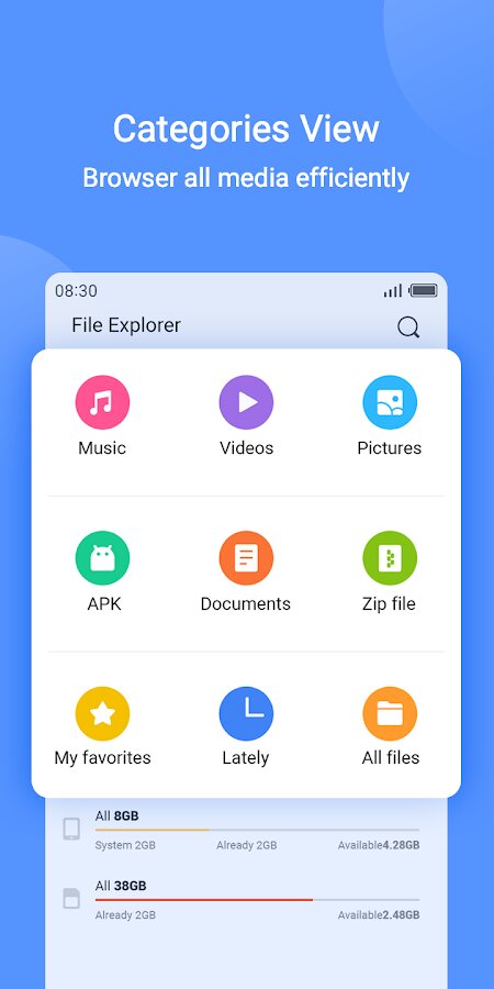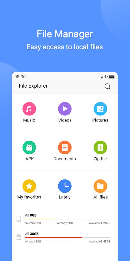 - Легкий доступ к локальным файлам: Все файлы больше не скрыты в мобильной системе. Файловый менеджер поможет вам легко найти файл, распределить его по категориям. Он также поддерживает множество функций: глобальный поиск, перемещение, удаление, открытие и обмен файлами, а также переименование, разархивирование и копирование-вставку.