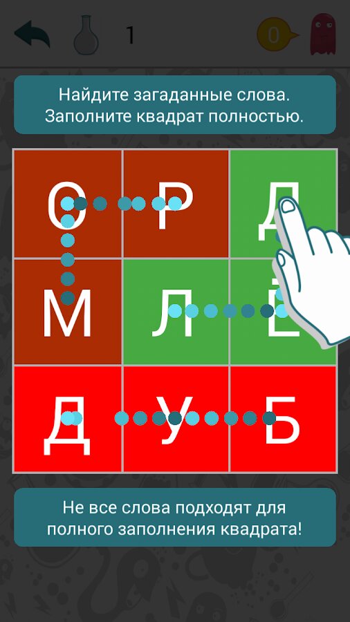 В начале игры вам предоставляется небольшое поле с разными буквами. Чтобы получить из букв слова – вам нужно соединять буквы линией, не отрывая палец от экрана. Но главная задача – это заполнить весь квадрат словами из стоящих рядом букв. Линия может быть не только прямой, но и изгибаться во все стороны. Но будьте на чеку, ведь для решения уровня подойдут только загаданные слова!