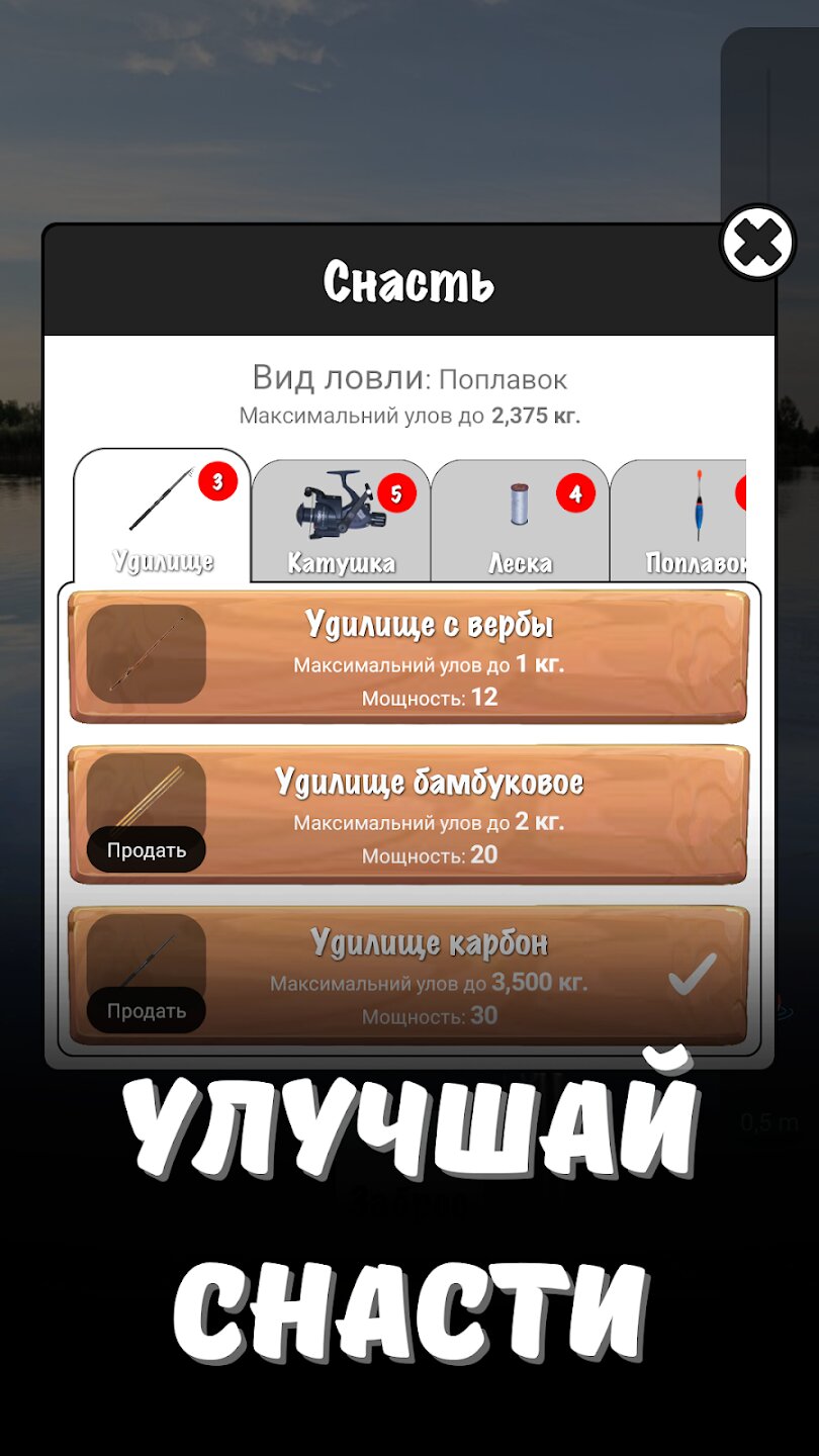 Проявите терпение и мастерство, чтобы поймать 40 видов водных обитателей – от обычных карасей до редких трофейных экземпляров. Экспериментируйте с приманками, улучшайте снасти и ремонтируйте оборудование для успешной ловли. Продавайте улов, чтобы приобретать новое снаряжение в магазине.