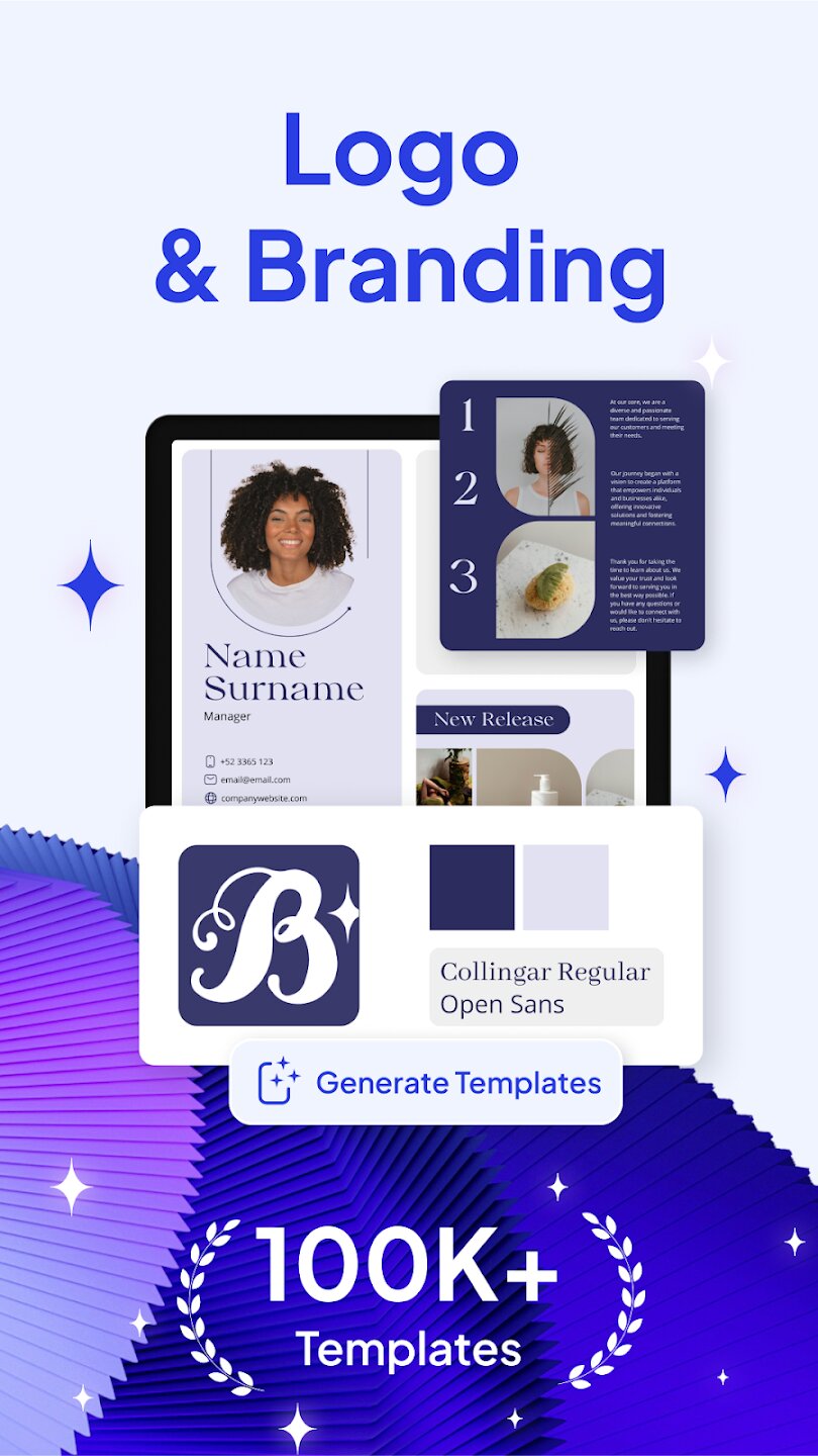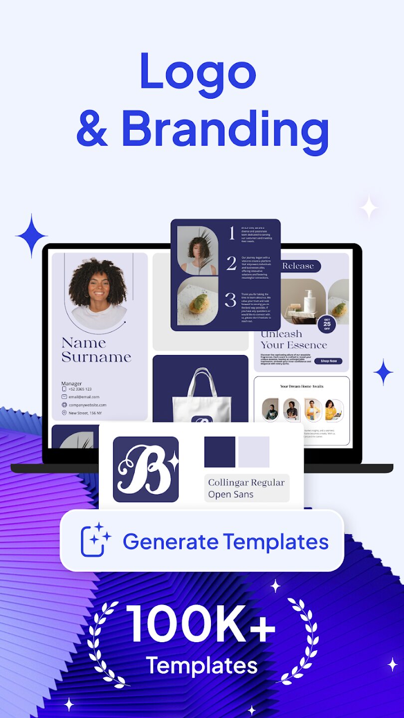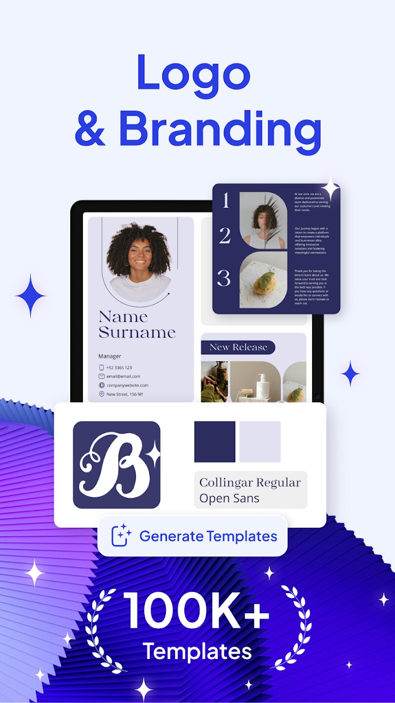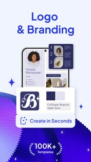 - Мгновенный логотип и брендинг: быстро создайте профессиональный логотип и создайте библиотеку брендов с помощью продуманных цветов, значков и шрифтов.