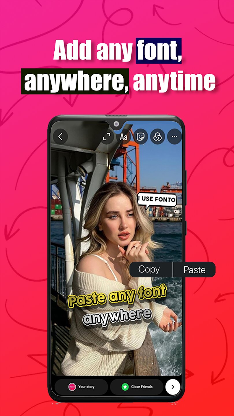 Fonto предоставляет прямой способ улучшить ваши Instagram* Stories с помощью красивых шрифтов и фонов, устраняя необходимость в сложном редактировании в других приложениях. Его основная функция — позволить вам создавать стильные текстовые наложения, которые можно легко интегрировать в ваш контент. Используя привлекательную типографику и настраиваемые фоны цветов материалов, вы можете значительно увеличить вовлеченность зрителей и удержание внимания на ваших историях, помогая вашему профилю выделиться в переполненной ленте.